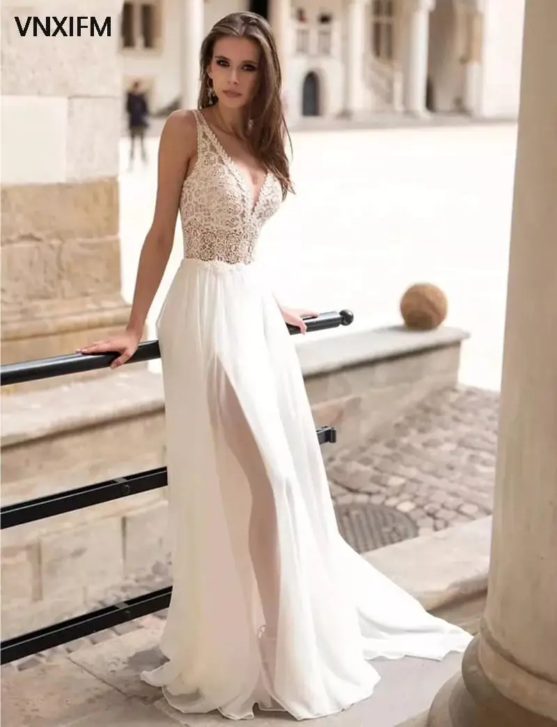 Пляжные шифоновые Свадебные платья съемные пышные рукава v-образный вырез кружева аппликации открытая спина Бохо элегантные свадебные платья Vestidos De Novia