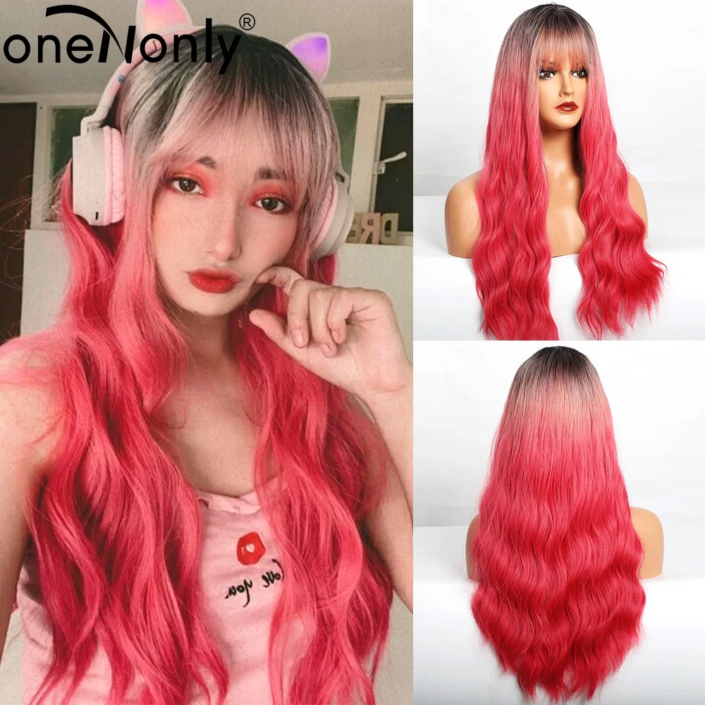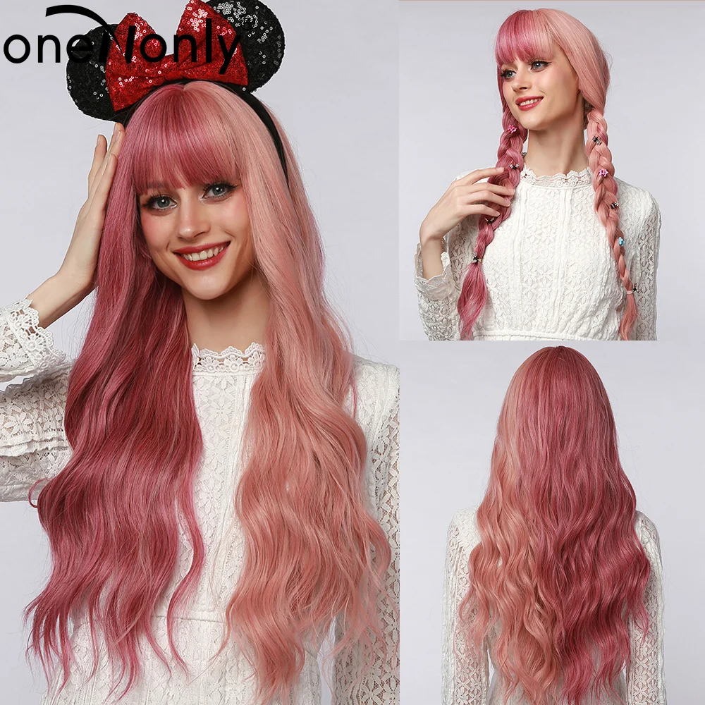 OneNonly Длинный розовый парик с челкой, натуральные волнистые терм...