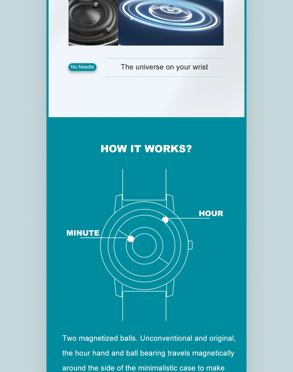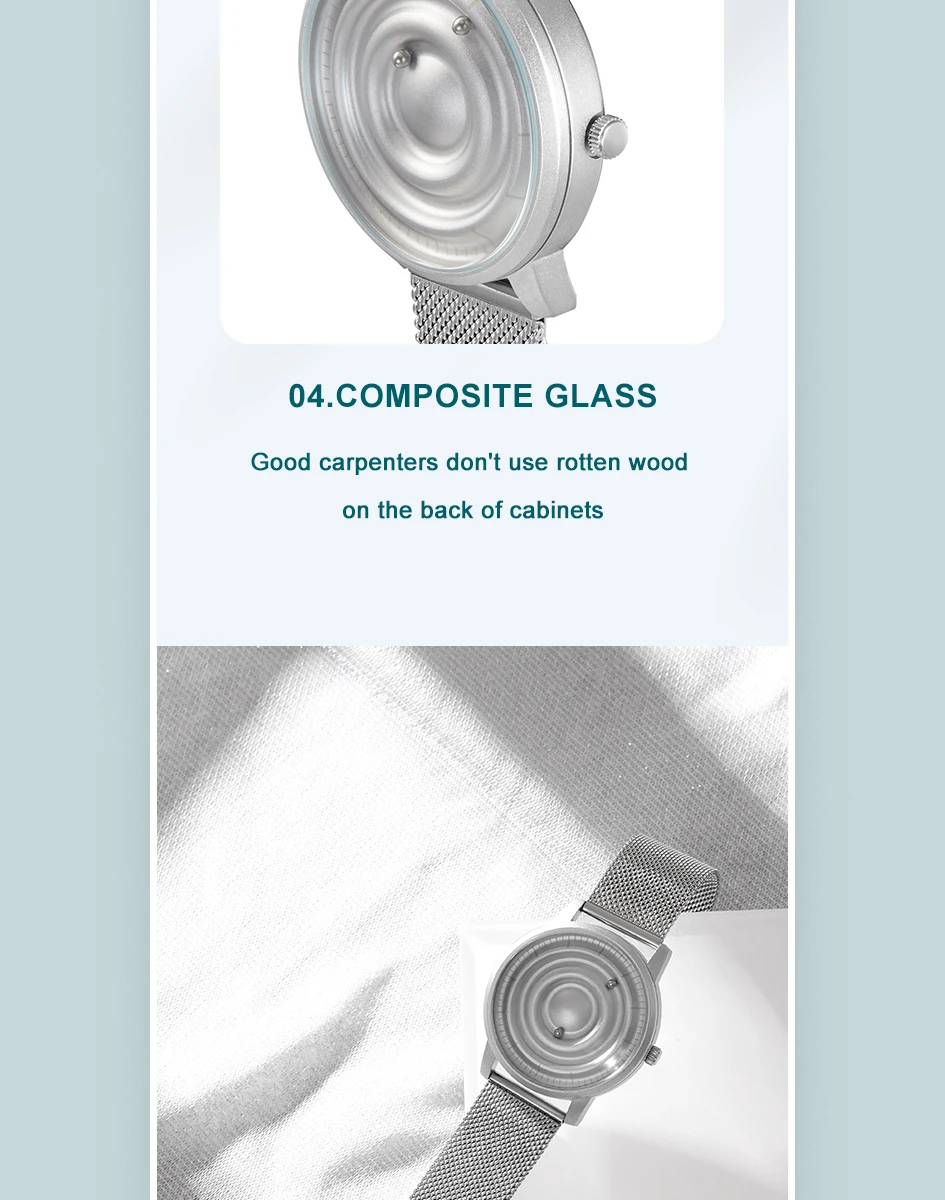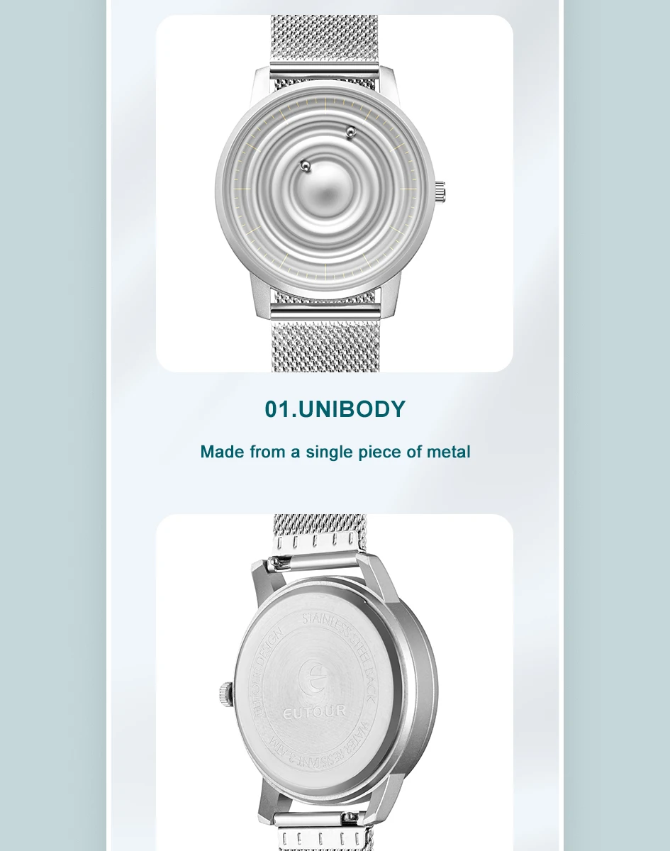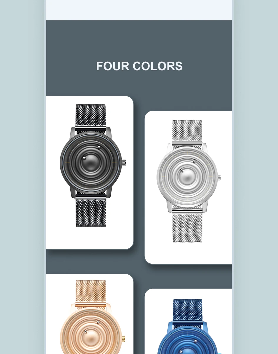 Основная особенность:1 Уникальное Отображение времени:Два магнитных стальных шарика показывают время: час и минуты2 шарика управляются магнитной силой, время ощущается при прикосновении к стальному шару3 Использование тисненой конструкции для представления 12 точек облегчает восприятие времени4 Модные 30 м водонепроницаемые часы, чехол из нержавеющей стали5 съемный ремешок дизайн: четыре варианта из нержавеющей стали, кожаный ремешок, холст и силиконовый ремешокСпецификация (приблизительная):Чехол Диаметр: 38,0 ммЧехол Толщина: 10,0 ммШирина ремешка: 20 ммОбщая длина: 240 ммКак это работает?-В каждом часе есть два шариковых подшипника, которые используют намагниченную технологию для путешествий по лицу часов.-Один Трек показан на внешнем краю часов для часовой стрелки, а другой расположен во внутреннем кромке для минутной стрелки.Обратите внимание:Два мяча на часах отличаются магнитной силой Благодаря внутренней конструкции;Шары могут бегать, когда ваша рука движется, но они останутся в правильном положении и покажут правильное время, когда часы будут мешать