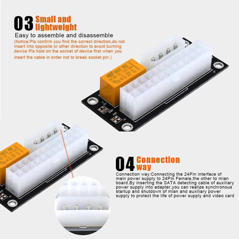 При одновременном подключении 5 графических карт к размахиванию монет, имеющегося источника питания недостаточно, источник питания высокой мощности отсутствует на складе, и цена довольно высока, вы можете использовать эту карту для включения и выключения двух источников питания одновременно, И распределите питание видеокарты на два источника питания, чтобы заменить источник питания высокой мощности.