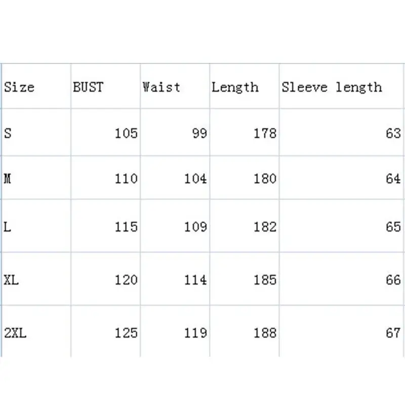 Размер (см) S: Длина: 178 Бюст: 105 рукав: 63 талия: 99 M: Длина: 180 бюст: 110 рукав: 64 талия: 104 L: Длина: 182 Бюст: 115 рукав: 65 талия: 109 XL: Длина: 185 Бюст: 120 рукав: 66 талия: 114 XXL: длина: 188 Бюст: 125 рукав: 67 Талия: 119