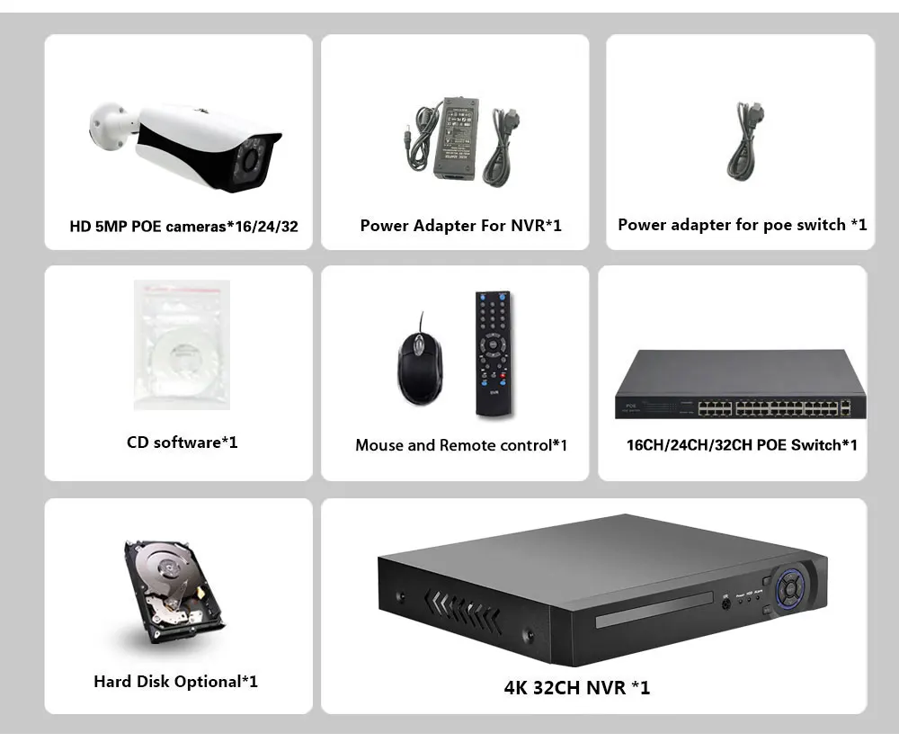 1 сетевой видеорегистратор 32CH 4K NVR;16/24/32 x HD 5.0MP POE IP Крытый Открытый ИК День ночного видения атмосферостойкие камеры;1x16/ 24CH/32CH POE переключатель1x источник питания для POE Switch1 x Блок питания для NVR;1 х USB мышь для NVR;1 компакт-диск программного обеспечения для NVR;1 пульт дистанционного управления для NVR;Жесткий диск опционально!