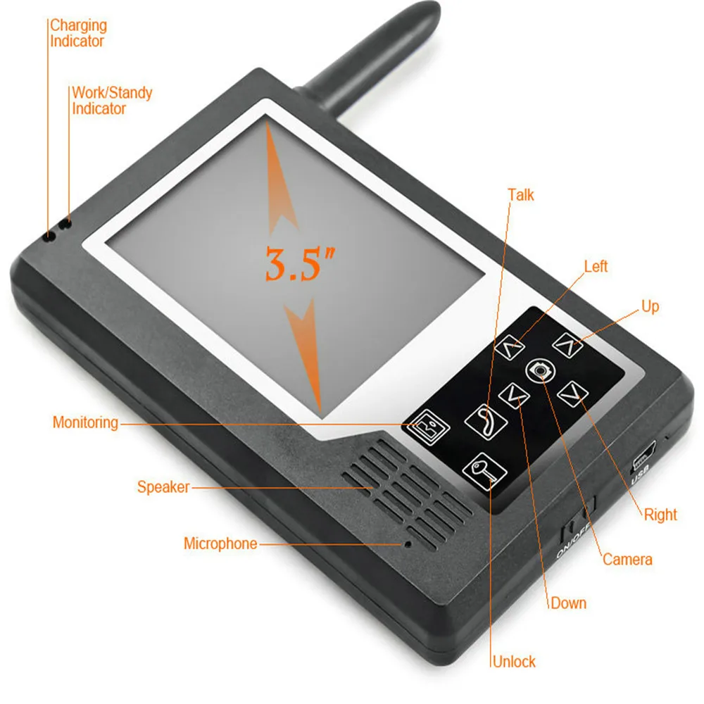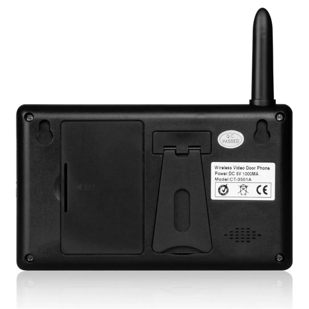 Особенности:2,4 ГГц частота запуска, около> 400 м барьер Бесплатная дистанционный пульт дистанционного.С технологией микро-обработки, автоматическим дистанционным управлением, отличной производительностью и высокой надежностью.3,5 "TFT цветной дисплей.0,3 мегапиксельная камера.Четкий ночной просмотр, говорение и разблокировка дистанционного управления и т. Д.Время отображается на внутреннем мониторе.Перезаряжаемая литиевая батарея с помощью мини-зарядного устройства.Монитор может снимать/сохранять/просматривать более 100 фотографий автоматически.Монитор может висеть на стене, шкафу, также можно разместить на столе, столе.Встроенные 16 мелодий chord.Характеристики:Наружная Камера:1. Рабочая скорость: 2402 ~ 2483,5 МГц2. Мощность передачи: 18 ~ 23dBM3. Камера: 1/4 "CMOS4. Рабочий ток: 300 мА5. Ток в режиме ожидания: 20 ~ 30 мА6. Батарея: перезаряжаемая литиевая батарея7. Емкость аккумулятора: 1350 мАч8. Время работы в режиме ожидания: 2 месяца9. Адаптер Входной сигнал: AC100 ~ 240 В пер. тока, 50/60 Гц10. Выход адаптера: DC5V/1A11. Размеры: 160*100*30 ммВнутренний монитор:13. Экран: 3,5 дюймов TFT ЖК-дисплей14. Чувствительность: 90 дБм15. Рабочий ток: 250 мА16. Ток холостого хода: 20-30mA/3,7 V17. Батарея: перезаряжаемая литиевая батарея18. Емкость аккумулятора: 1350 мАч19. Время работы в режиме ожидания: 120 ч20. Адаптер Входной сигнал: AC100 ~ 240 В пер. тока, 50/60 Гц21. Выход адаптера: DC5V/1A22. Размер: 141*85*20 ммРабочая температура: -20 градусов-+ 50 градусов