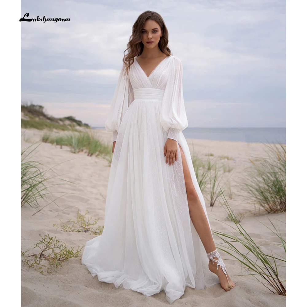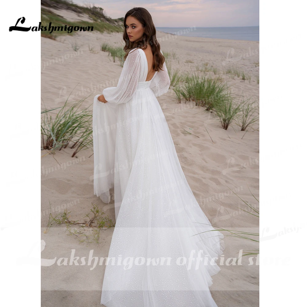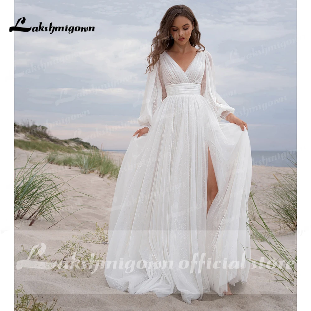 Женское платье с длинным рукавом, блестящее свадебное платье с V-образным вырезом в стиле бохо, свадебное платье со шлейфом