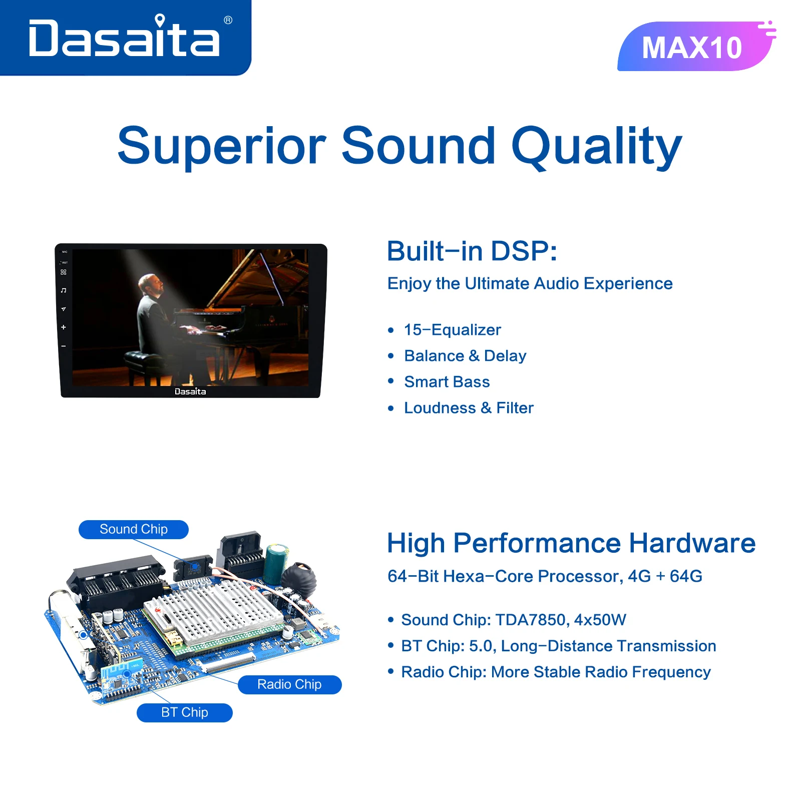 Легко Создайте свою собственную звуковую системуИ благодаря встроенному усилению 4*50 Вт музыка становится четкой даже при высоких объемах.Встроенный поп, рок, джаз, классика, плоская, пользовательская, голосовая, звуковая задержкаНесколько вариантов настройки позволяют адаптировать аудио опыт по своему вкусу.
