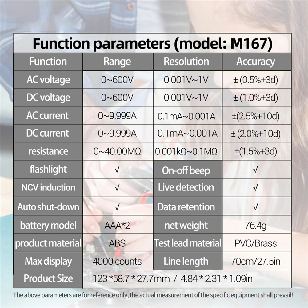 Цифровой мультиметр M167, 4000 отсчетов, тестер переменногопостоянного напряжения и тока, измеритель, детектор сопротивления с фонариком Data Hold NCV