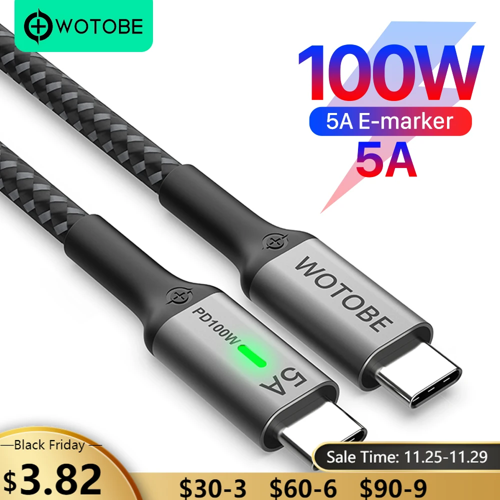 Кабель WOTOBEUS с USB C на USB C, 100 Вт, Type-C 5A E Mark, быстрая зарядка, нейлоновый плетеный шнур со светодиодной подсветкой, совместимый с MacBook Pro iPad