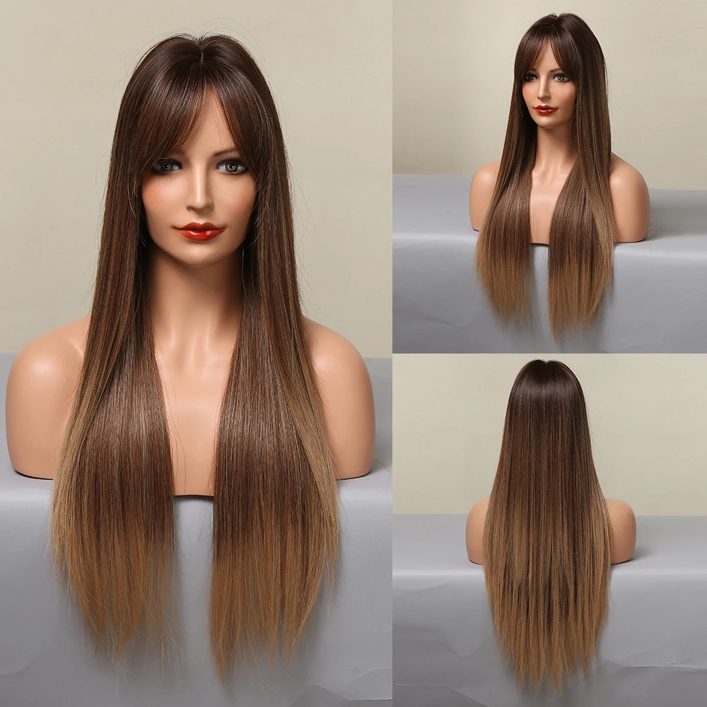 Парик длинный прямой с челкой для женщин, термостойкие синтетические парики с черным или коричневым эффектом омбре из натуральных волос на каждый день