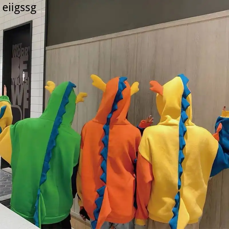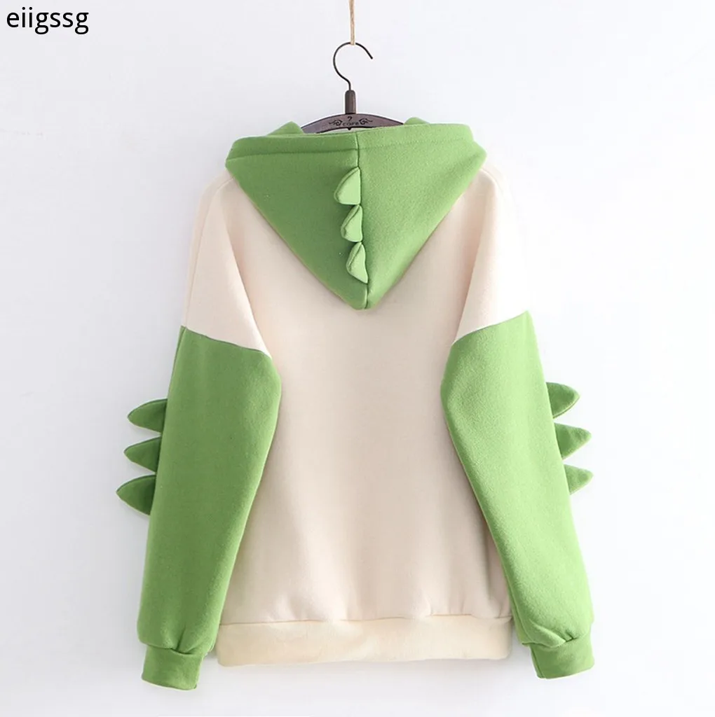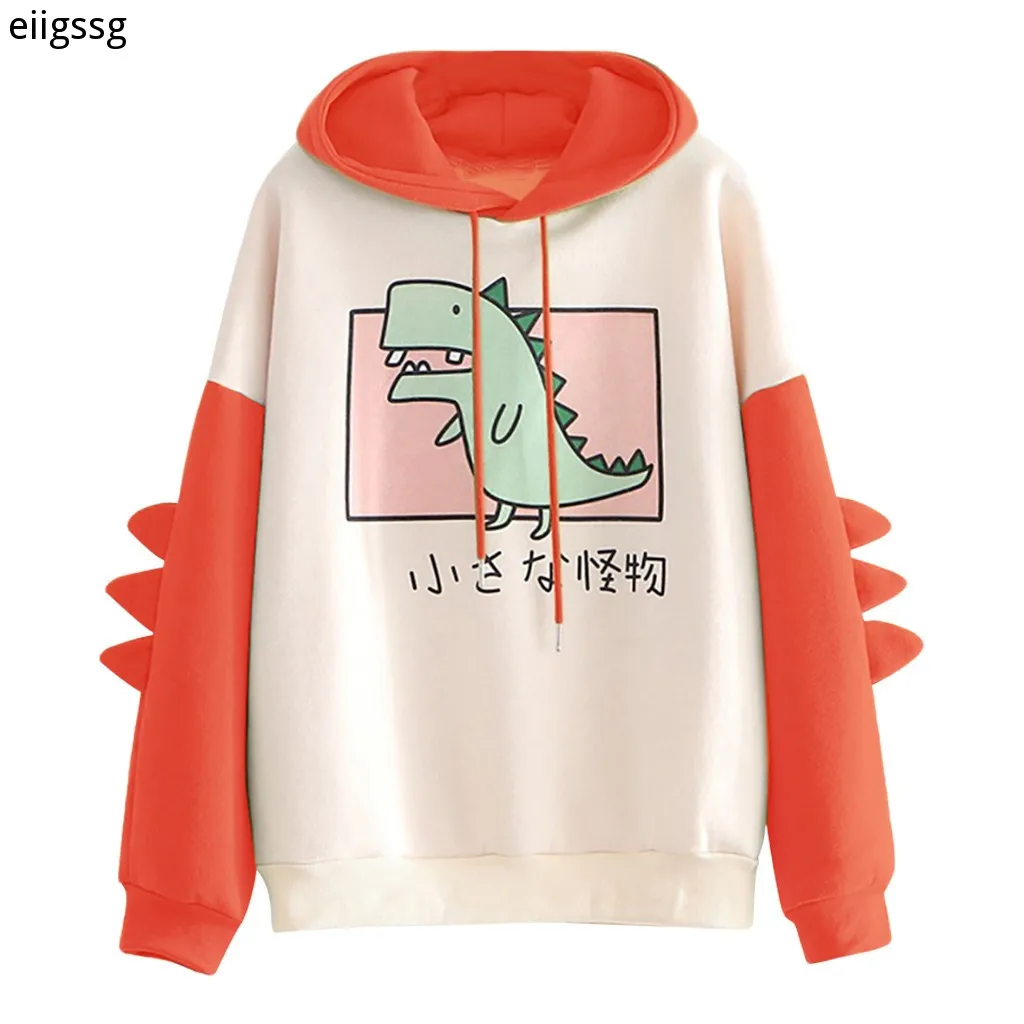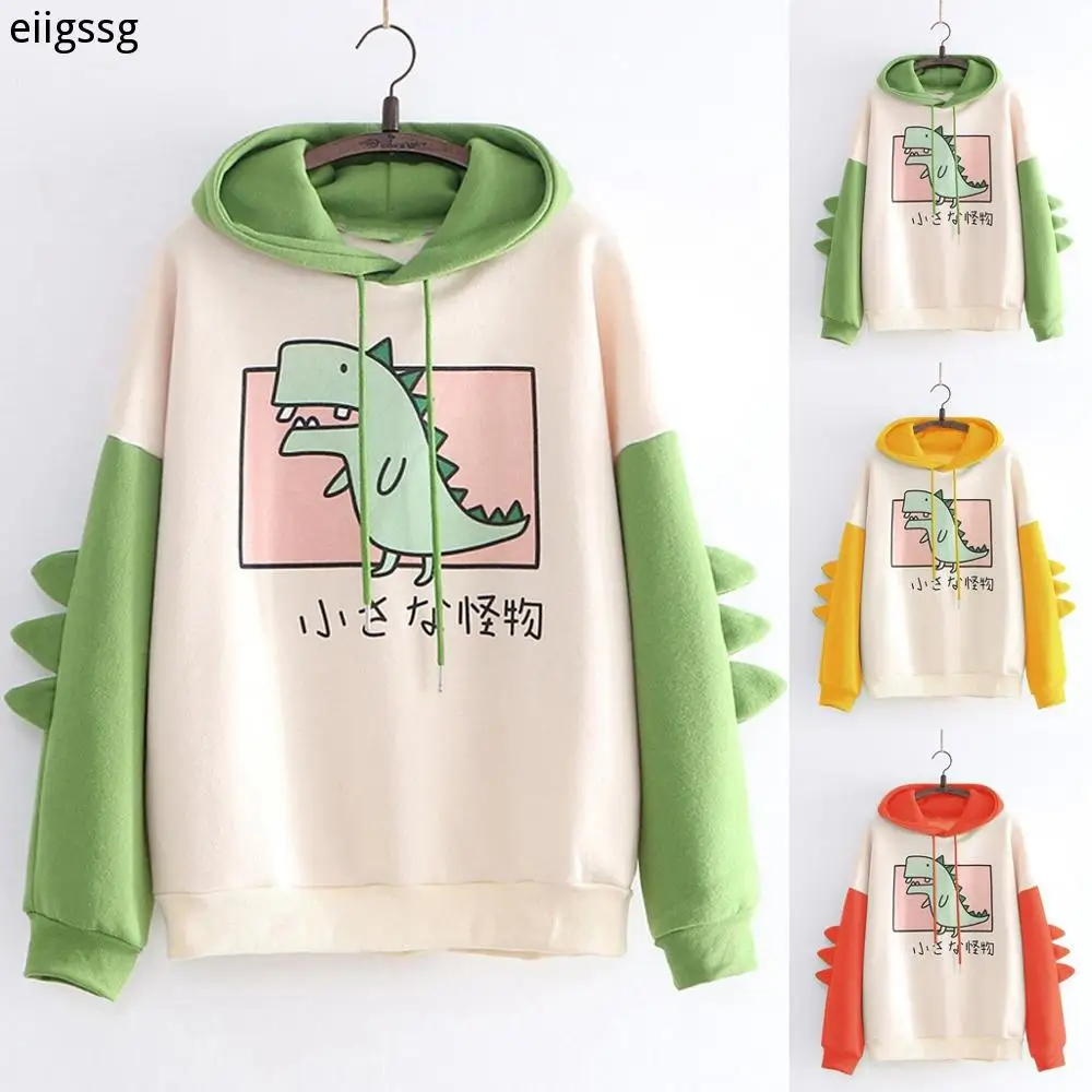 Женская толстовка с динозавром из мультфильма оверсайз, модная повседневная толстовка с принтом в Корейском стиле, Утепленная зимняя толстовка с капюшоном, топы