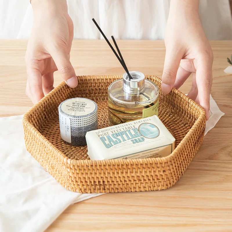Ротанговый поднос для хранения, плетеная корзина ручной работы, сервировочный поднос из ротанга, плетеная корзина для хлеба, фруктов, еды, завтрака-ручной поднос для фруктового хлеба, плетеная корзина, поднос для хранения, японский поднос для чая ручной работы, декоративный поднос для чайной чашки.