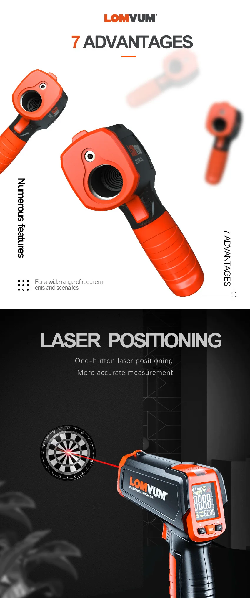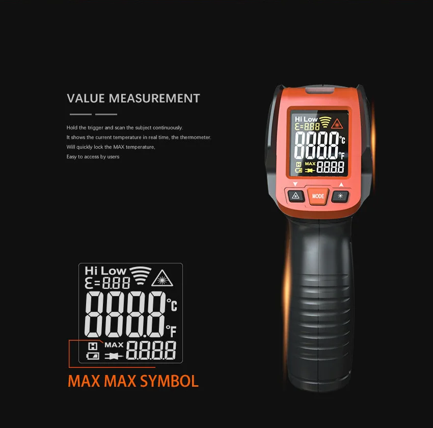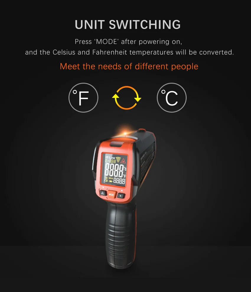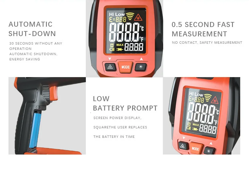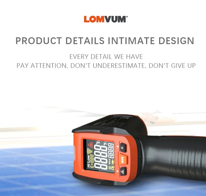 LOMVUM IR TEM GUN широко используется для бесконтактных измерений в таких отраслях, как промышленность и энергосбережение, вы можете измерить температуру поверхности нефти, химических веществ, железных дорог, электричества, текстиля, пластмасс, металл и т. Д. Быстро. Он также может использоваться для ежедневного измерения температуры, например, для еды, восстановления автомобиля, холодильника, бассейна и т. д.