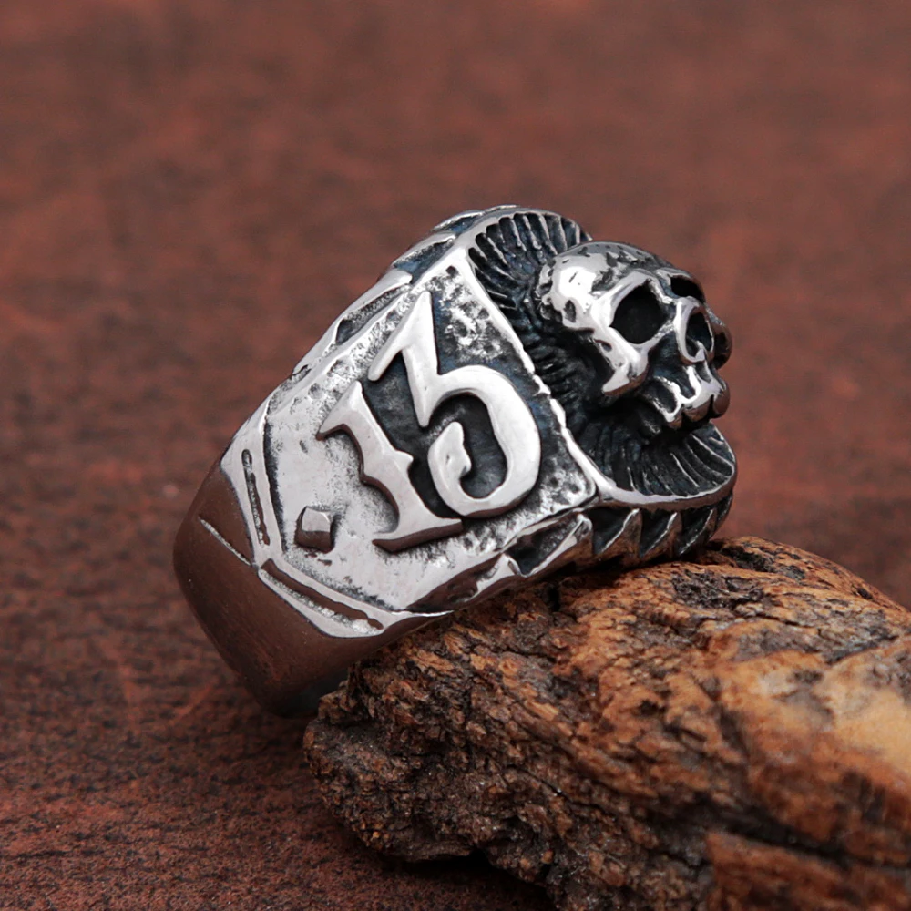 Название: модное кольцо в стиле панк 13 с цифрой удачи для мужчин в стиле хип-хоп, рок, Байкер из нержавеющей стали, готическое кольцо с черепом, амулет, ювелирное изделие, подарок, оптовая продажа