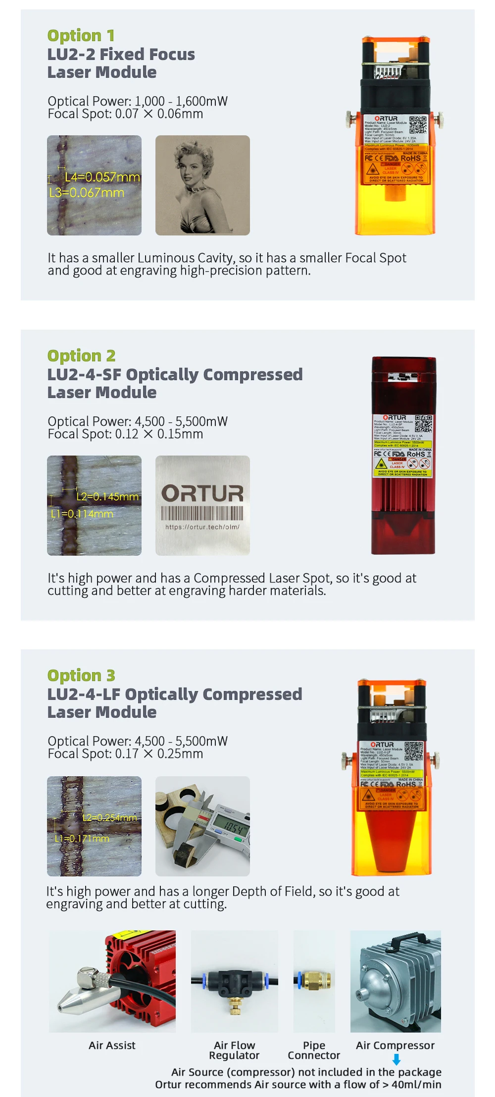 Available Laser ModulesLU2-4 24V FAC Laser Module (Electric Power: 20W, Luminous Power: 4,500-5,000mw)