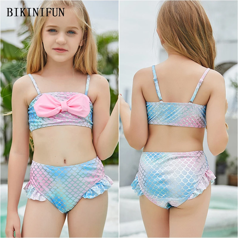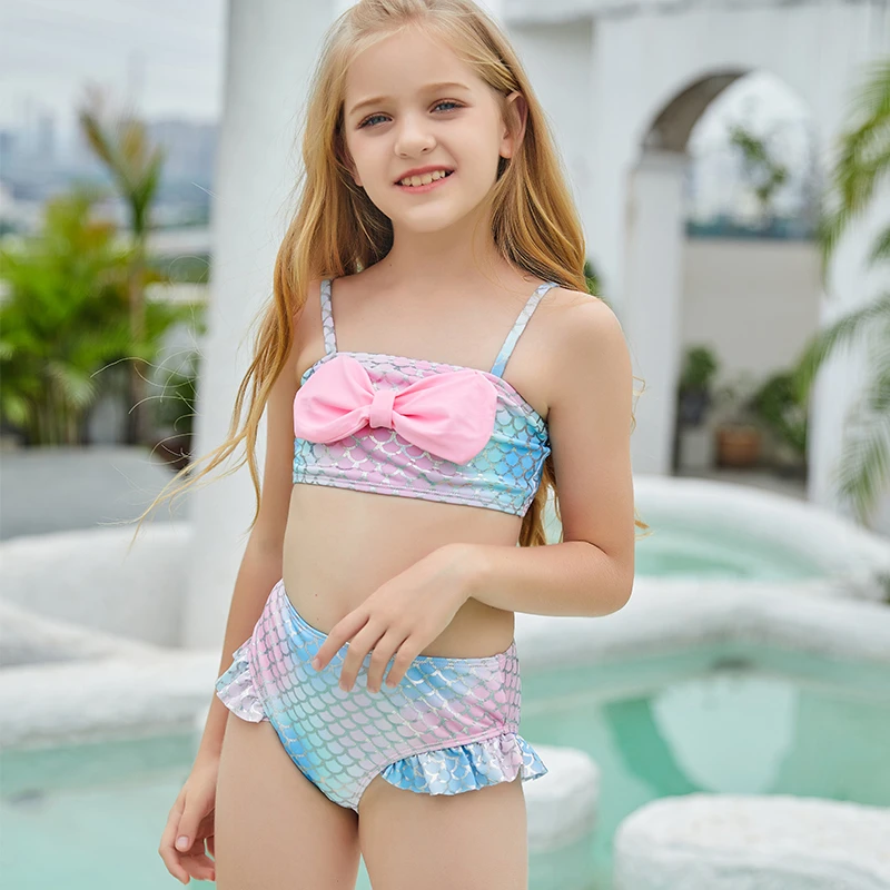 От 4 до 13 лет для девочек; Новинка; Купальный костюм в стиле Русалочки; Детский купальный костюм с рыбками и бантиком; Пляжная одежда для подростков; Комплект бикини с открытой спиной
