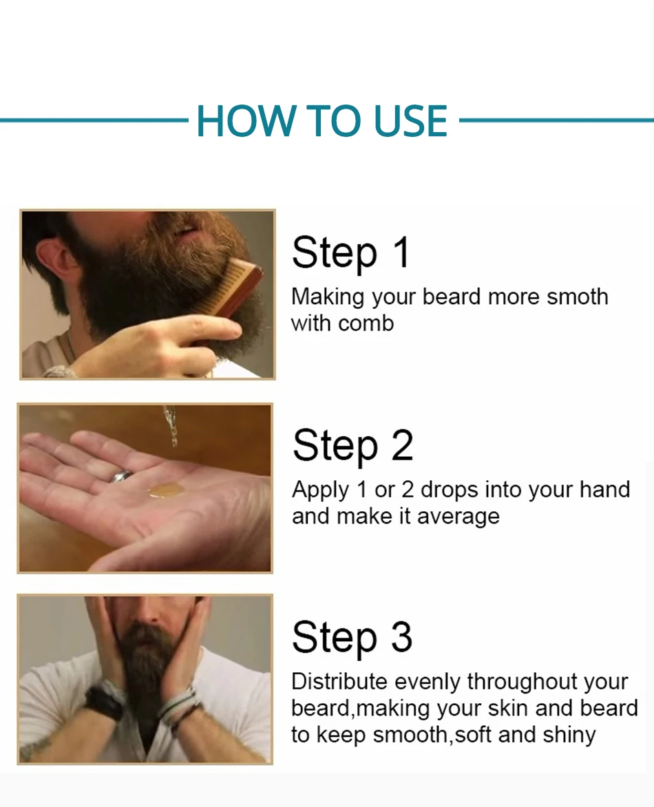 Шаг 1Делает вашу бороду более гладкой с расческойШаг 2Нанесите 1 или 2 капли на ваш hano и сделайте его среднимШаг 3Равномерно распределите по всей бороде, делая вашу кожу и бороду гладкой. Мягкая и блестящая