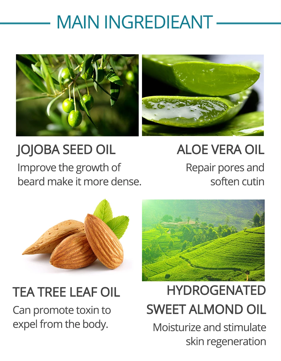 Масло семян жожобаУлучшение роста бороды делает его более плотным.Масло алоэ вераВосстанавливает поры и смягчает кутин.Масло листьев чайного дереваМожет способствовать вытеснению токсинов из организма.ГидрогенизированныйМасло сладкого миндаляРегенерация моистуриза и стимулятора