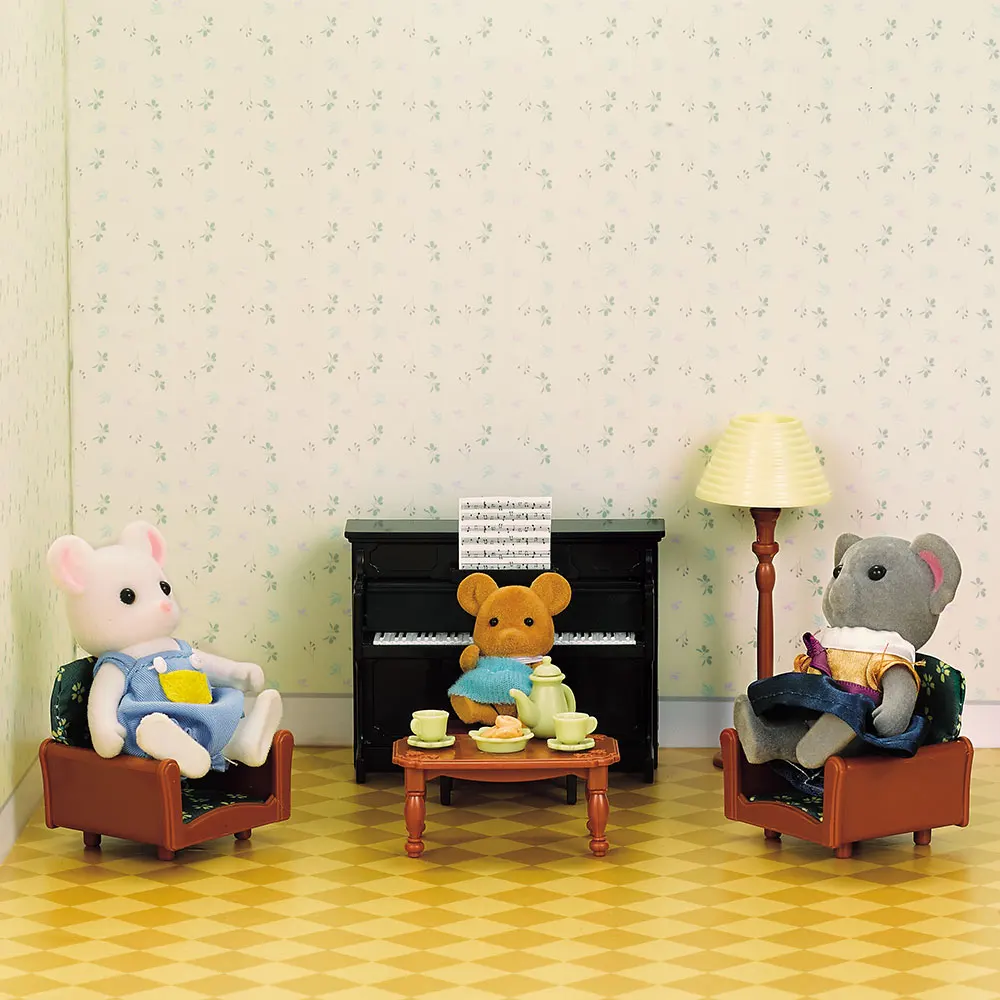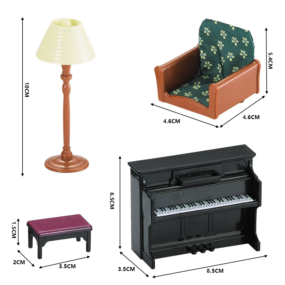 Посылка включает в себя: 2 * тканевый диван, 1 * пианино, 1 * Маленький стул, 1 * настольная лампа, 1 * ретро стол 6,* Посуда