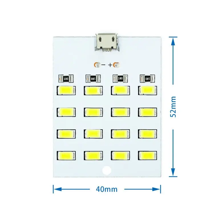 Лампа изготовлена из высококачественных бусин, алюминиевой подложки и микро-usb для интерфейса источника питания. Удобно получить доступ к обычному зарядному устройству на мобильный телефон и мобильному источнику питания. Установленный рабочий ток относительно большой, значение тока составляет 430 мА ~ 470 мА, что может обеспечить достаточную яркость и имеет лучшую конструкцию рассеивания тепла, так что температура не слишком высока. Соответствующий ограничительный резистор тока принимает 1210 больших упаковок, необычный светодиодный ночник с одним 0805 малым сопротивлением упаковкам.