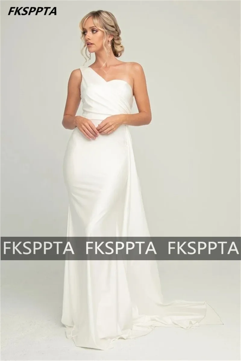 Длинное блестящее атласное платье с юбкой-годе, на одно плечо