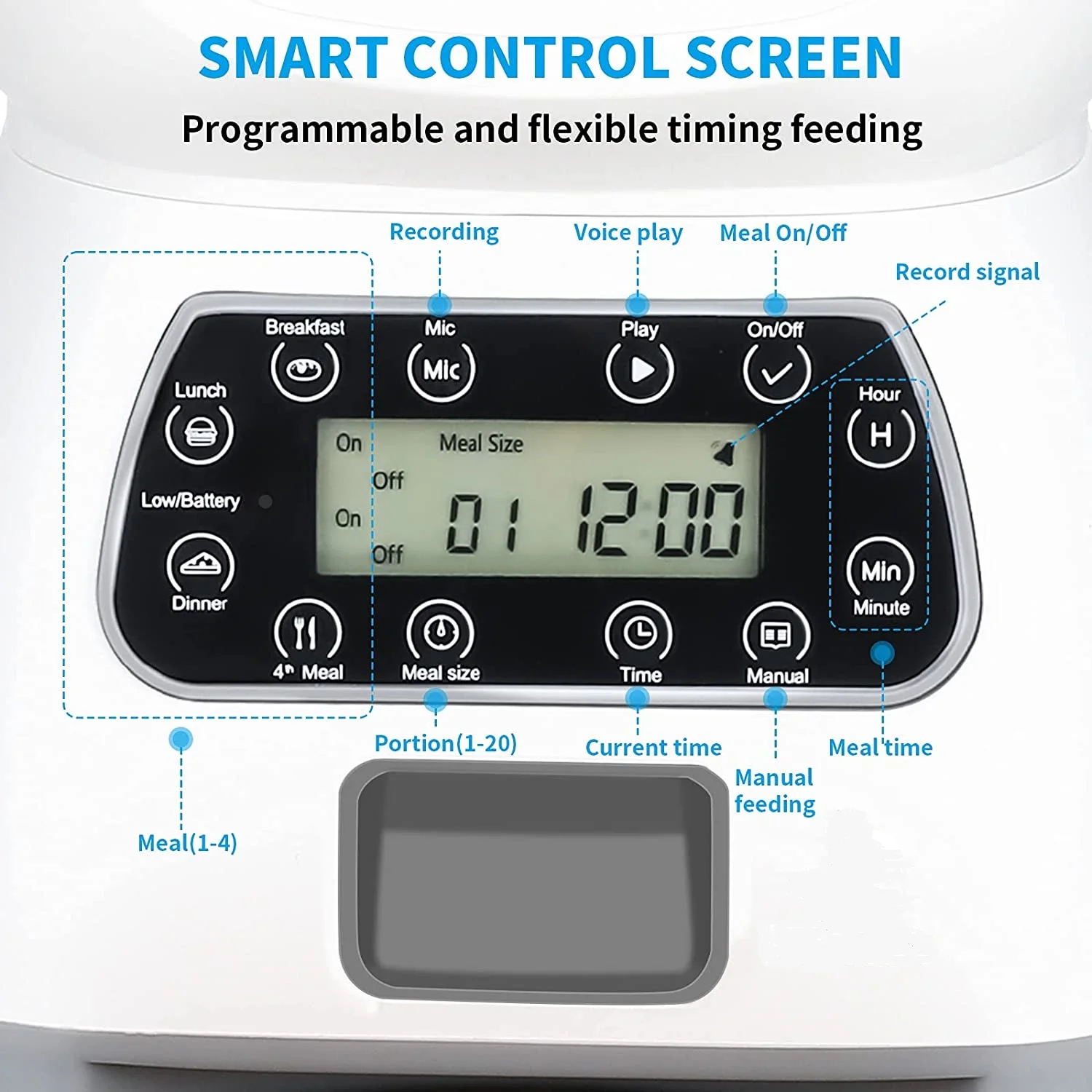 Запишите пользовательское сообщение для вашего питомца: Держите вашего питомца в восторге от времени еды! Нажмите и удерживайте кнопку записи, чтобы начать запись голосового сообщения, которое будет воспроизводиться по мере подачи. В противном случае, каждый раз, когда вы находитесь вдали от дома, в то время как вы хотите, чтобы утешить своего питомца и сообщить ему, что вы с ним, вы можете установить время кормления ближе всего к настоящему времени и когда еда погрузилась, он слышит запись вашего голоса и не чувствует себя одиноким. (Е. g. Здесь, Fido! Приходите и ешьте)