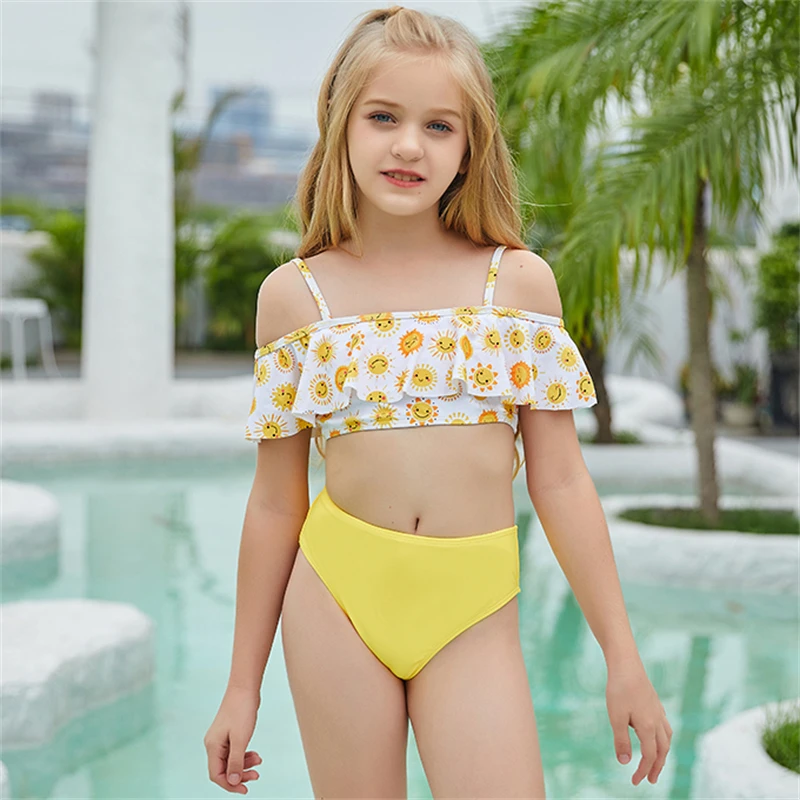 От 4 до 13 лет, новинка, купальник с открытыми плечами для девочек, детская пляжная одежда со смайликом, купальник с высокой талией для подростков, боди с открытой спиной, комплект бикини