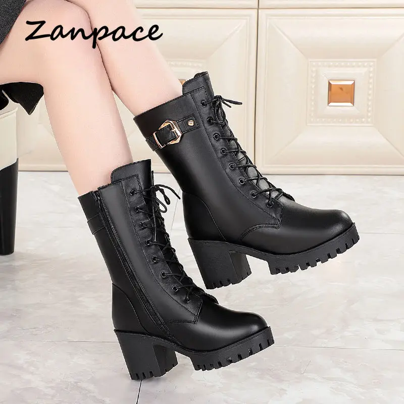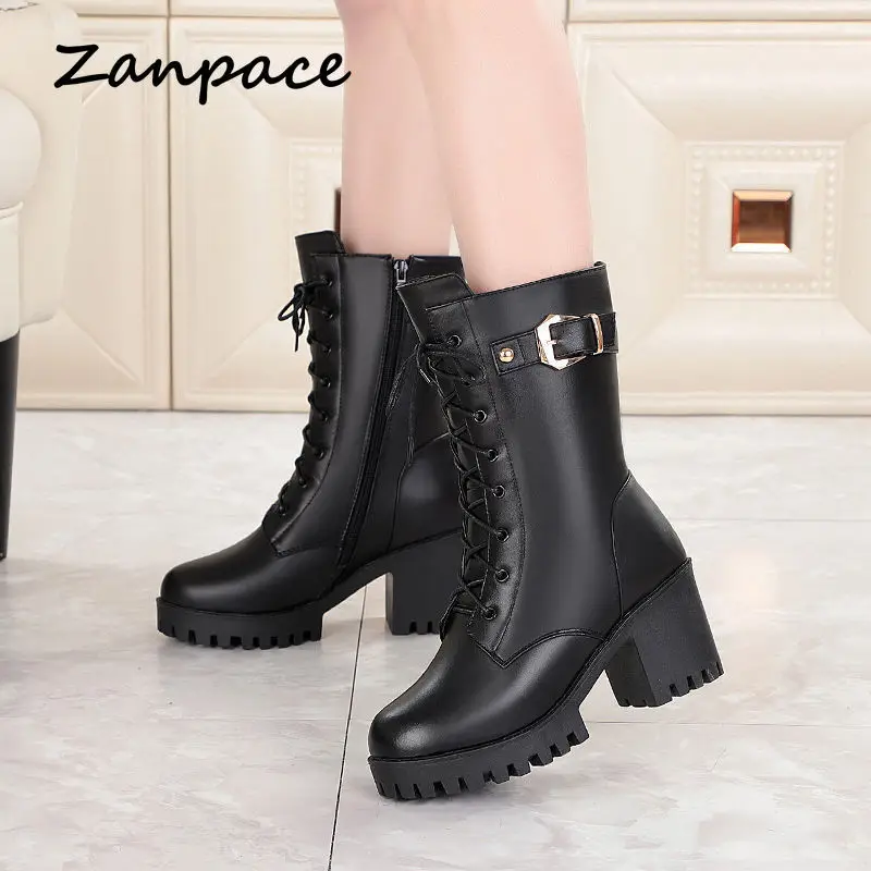 Зимние кожаные женские сапоги 2021, нескользящая теплая женская обувь на высоком каблуке, Короткие хлопковые сапоги на платформе, женские зимние сапоги больших размеров