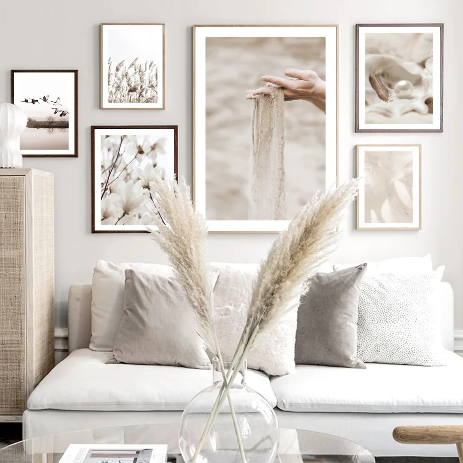Картина на холсте с песком, перламутровым пером, тростник, цветок, скандинавские постеры и принты, настенные картинки для декора гостиной