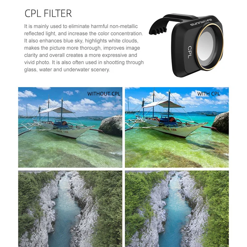 Особенности:1- MCUV (ультрафиолетовый) фильтр уменьшает дымку и Улучшает контрастность видео и цифровых изображений, уменьшая количество ультрафиолетового (УФ) светильник. Особенно полезно в областях высокой высоты, снега или пляжа, устраняя нежелательные синие отливки. Импортированное Оптическое стекло, верхний уровень пропускания.2-ND выступает за фильтр нейтральной плотности, который действует как солнцезащитные очки для камеры дрона. Они будут темнеть то, что видят камеры, так что вы можете использовать более низкую скорость затвора, так что ваши кадры выглядят более гладкими и более кинематографическими. Они оцениваются как сильные (как темные) они, чем выше число, тем сильнее или темнее они.-ND4 фильтр позволяет 1/4 входящих светильник, мощностью до 2-стоп фильтр для незначительное снижение яркости для регулировки скорости затвора.-ND8 фильтр позволяет 1/8 входящих светильник, равна с нейтральной плотностью (3) фильтр для частично, в большинстве случаев в пасмурные дни или приближением закат или после восхода солнца.-ND16 фильтр позволяет 1/16 входящих светильник, мощностью до 4-стоп фильтр, частично пасмурные дни или с начала и до середины утро, средний Светильник.-ND32 фильтр позволяет 1/32 входящих светильник, равна 5-стоп фильтр лучше всего подходит для очень яркая, полная защита от солнца дней.3-PL выступает за поляризационный фильтр, этот тип фильтра уменьшает блики и улучшает насыщенность и четкость ваших фотографий и видео, особенно при съемке вокруг воды.4-ND + PL фильтры имеют как в одном фильтре, вы получите хорошую насыщенность и четкость от PL, и вы сможете контролировать скорость затвора и экспозицию с ND.