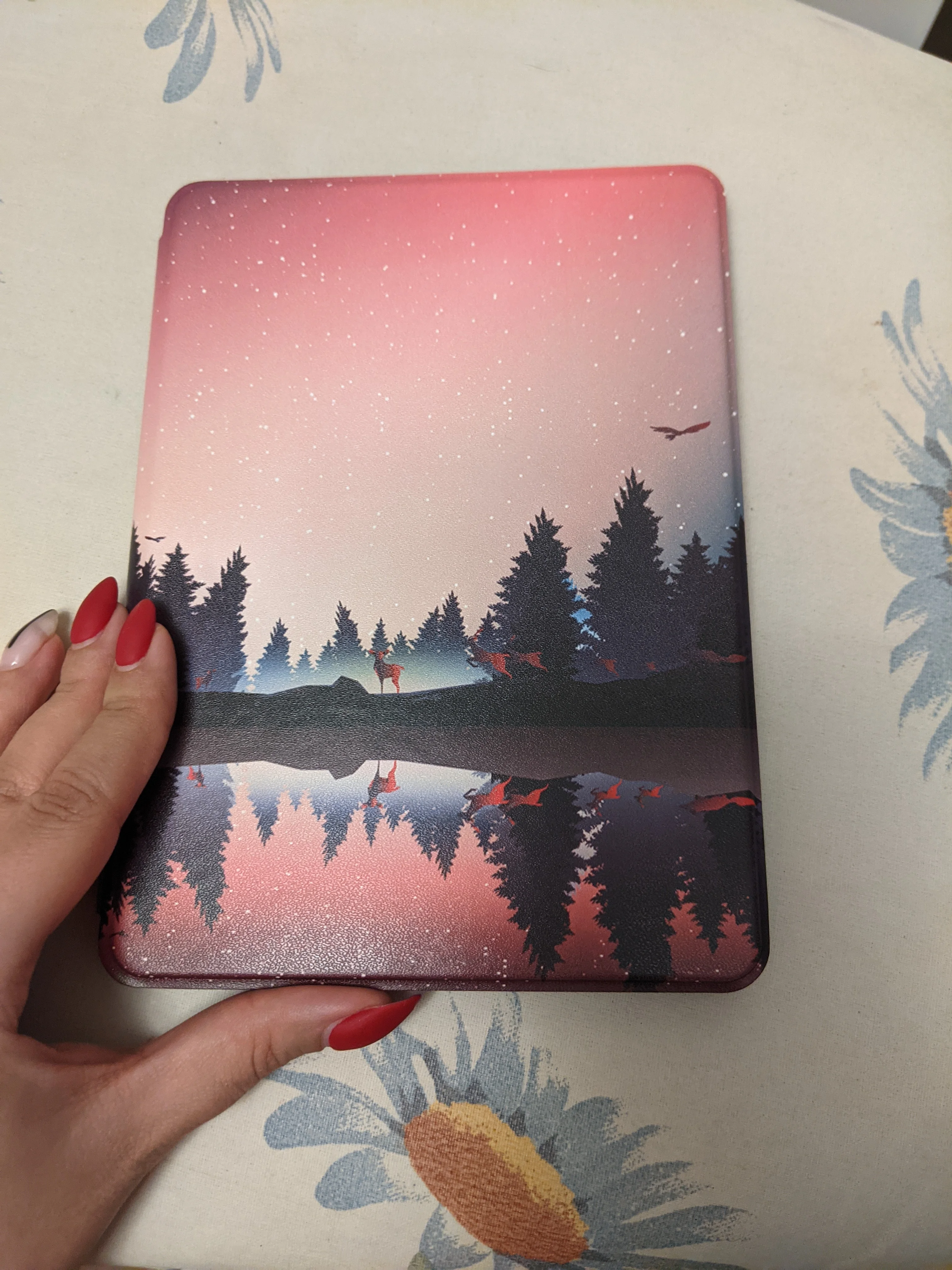 Чехол для свежего Paperwhite 2021 года, сидит отлично, принт качественный (взял с "библиотекой", выглядит весёленько и концептуально). Магнит работает, внутренняя часть обложки приятная наощупь, единственное беспокойство - образование залома на "корешке", когда после открытия книги лицевую часть обложки отгибаешь назад. Такое ощущение, что конструкция на это не особенно рассчитана, какого-то специального усиленного шва в месте сгиба не предусмотрено. Думаю, через некоторое время "залом" будет виден на корешке книги, и проявится в том числе на принте.