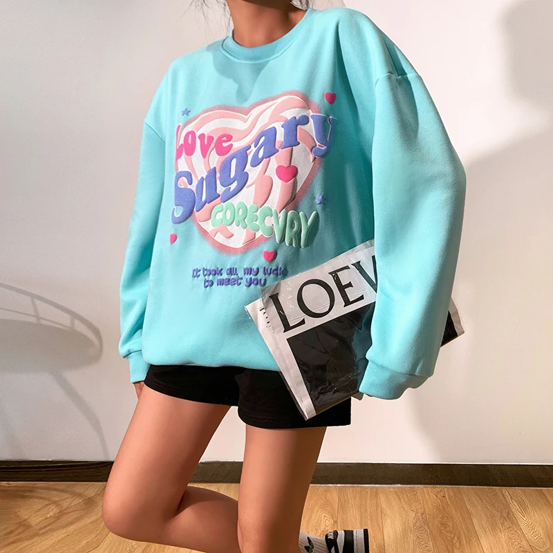 Женская весенне-осенняя Толстовка с длинным рукавом, женские повседневные креативные топы с надписью и принтом сердец и круглым воротником, свободная Базовая рубашка