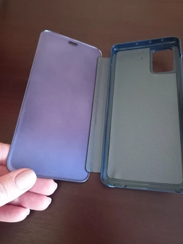 чехол впринципи хороший, но слегка не до конца плотно прилегает верхняя крышка, может потому что новый. Когда экран телефона выключен, смотрится просто как зеркало. Когда включен экран, то чехол прозрачный и всё видно.