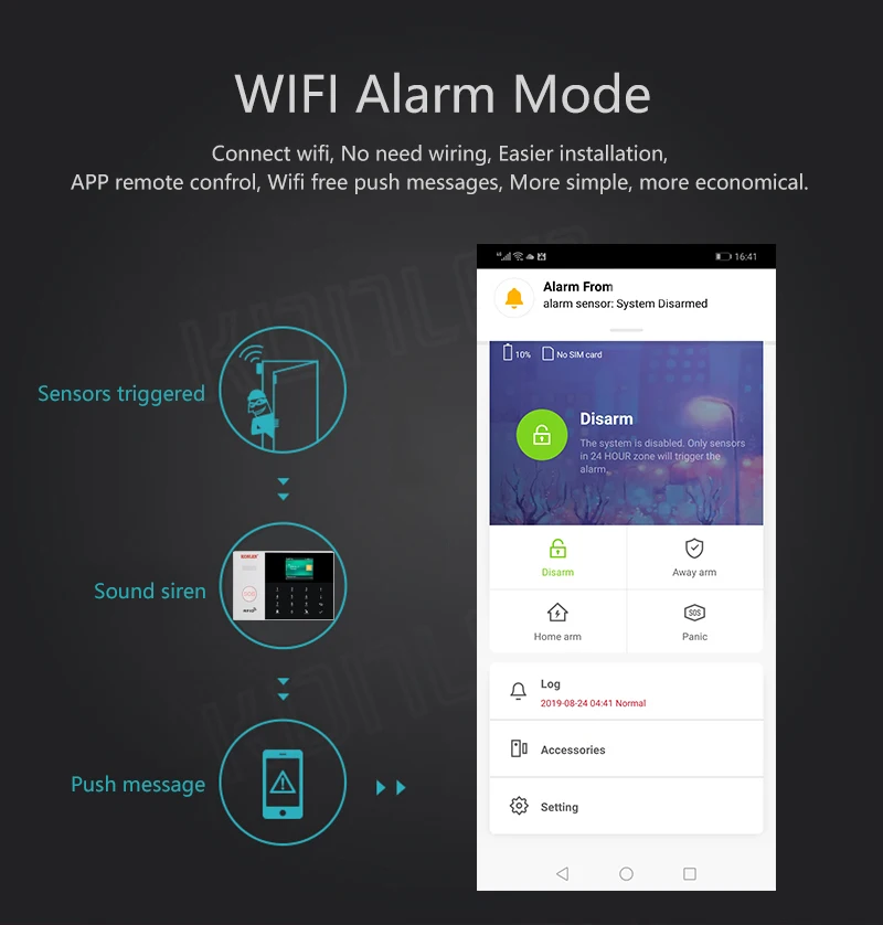 1. H37 панель будет нажимать уведомление о тревоге на ваш android или ios телефон через WIFI, когда кто-то сломается в вашем доме, в то же время звуковая Сирена.