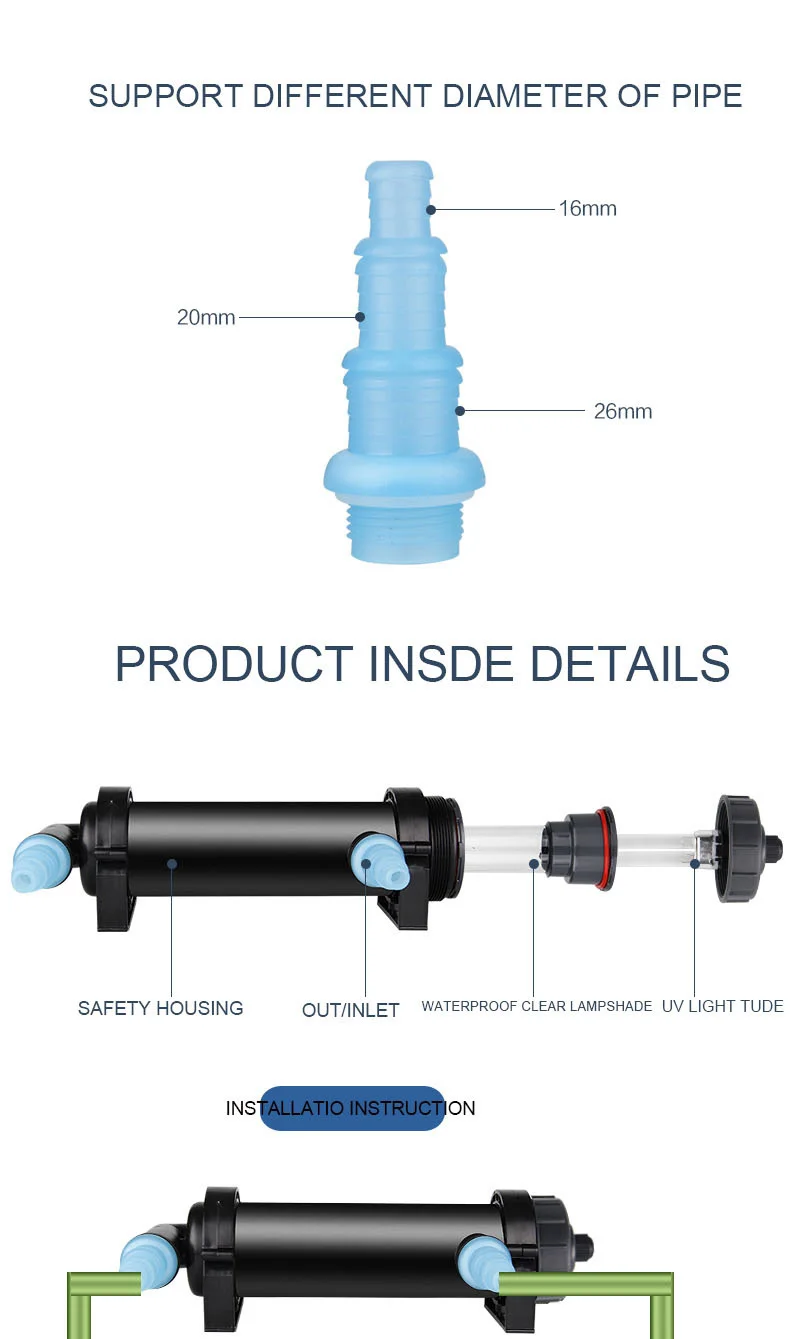 Мощность:5 Вт (35 ~ 60 галлонов) 7 Вт (40 ~ 75 галлонов) 9 Вт (45 ~ 150 галлонов)