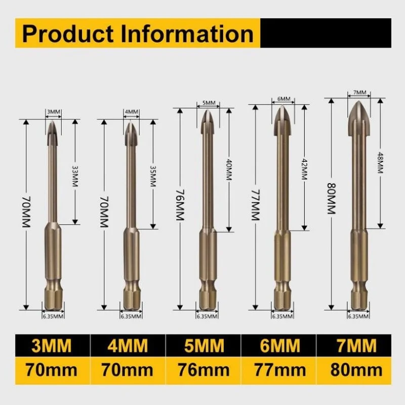 Набор сверл для стекла, керамики, бетона, карбида, 5 шт.