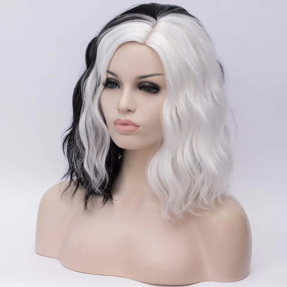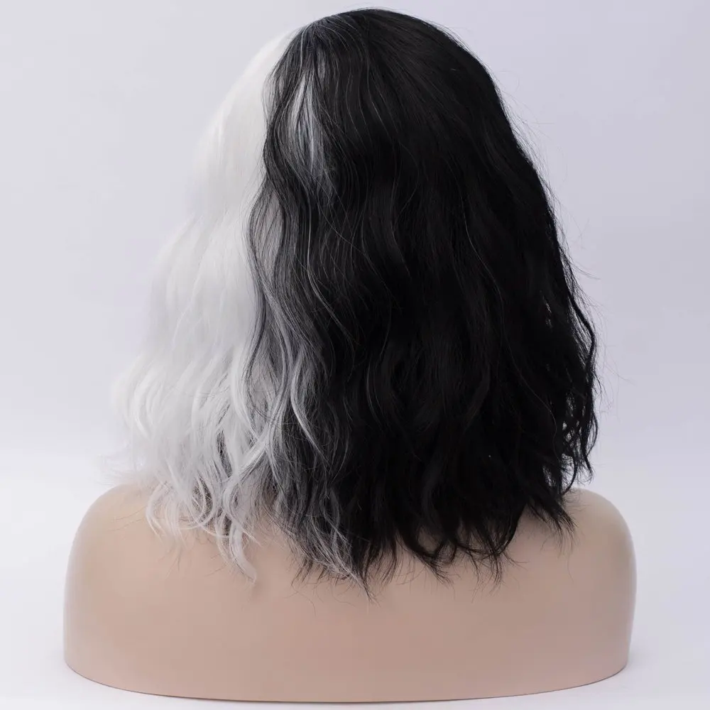 Cruella De Vil Kuila наполовину черные полубелые короткие вьющиеся волосы челки Боб косплей костюм на Хэллоуин синтетические аксессуары