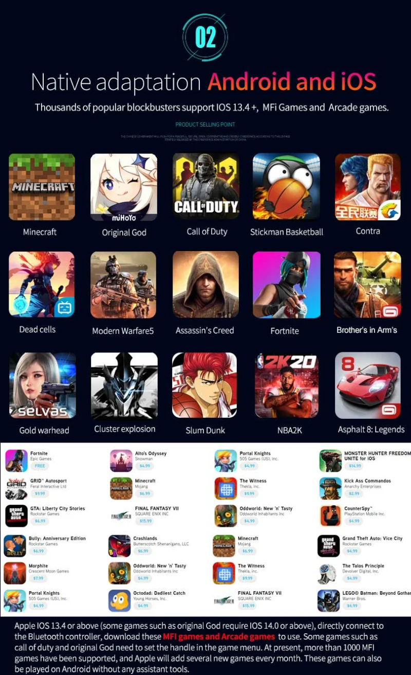 Поддерживает подавляющее большинство игр: 1) App store: например, Gunman Clive, Helium Boy, League of Evil 2 или Muffin Knight Free Stardash, для храма и так далее. 2) Android: для Wild blood, для Dungeon Hunter, для Zombie, для FC simulator, Для Shadow gun, для Riptide GP и т. д.
