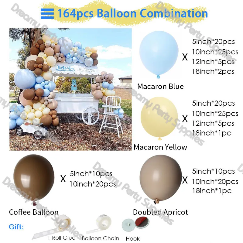 Синий Макарон (5 дюймов * 20 шт., 10 дюймов * 25 шт., 12 дюймов * 5 шт., 18 дюймов * 2 шт.) Желтый Макарон (5 дюймов * 20 шт., 10 дюймов * 25 шт., 12 дюймов * 5 шт., 18 дюймов * 1 шт.) Абрикосовый (5 дюймов * 10 шт., 10 дюймов * 20 шт., 18 дюймов * 1 шт.) Кофе (5 дюймов * 10 шт., 10 дюймов * 20 шт.) Подарок для вас: 5 м цепочка на воздушный шар * 1 Воздушный шар Клей * 100 Крючок * 3