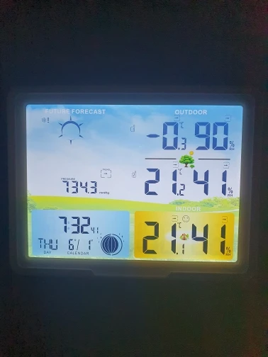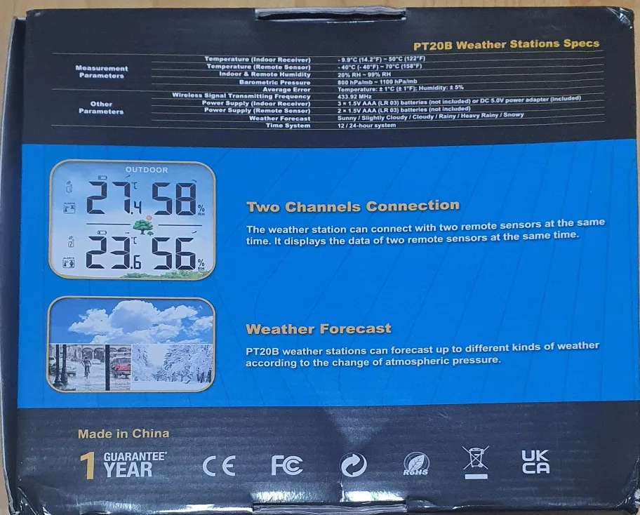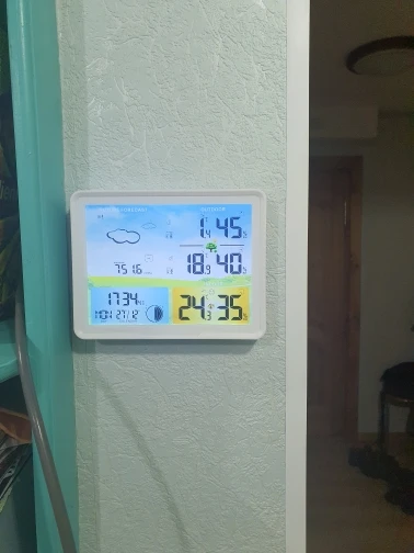 Good weather station. Screen is bit too light when viewing from an angle, but gets the job done. External sensors need some time to get into close measurements (just let them lay nearby station for a bit), but then it works just fine. It does show all 3 temps at once and it's easy to turn on backlight for easy read. That's very convenient. Хорошая станция. Экран немого слишком блеклый при взгляде под углом, но вполне работает. Внешним датчикам нужно время чтобы прийти к общим показаниям (просто дайте им полежать рядом с станцией), в последствии работают вполне адекватно. Показывает все 3 температуры одновременно и легко включается подсветка. Это очень удобно.