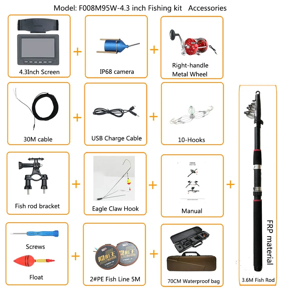 1x3,6 М удочка для рыбыUSB кабель (1 шт.);1 х металлическое морское колесо1 x Объектив камеры с кабелем 30 м2 х крючки1 x дисплей 4,3 дюйма1 x поплавок1 х кронштейн для удочки1 х Отвертка1X2 # PE леска 5 м1X70 см водонепроницаемый мешок
