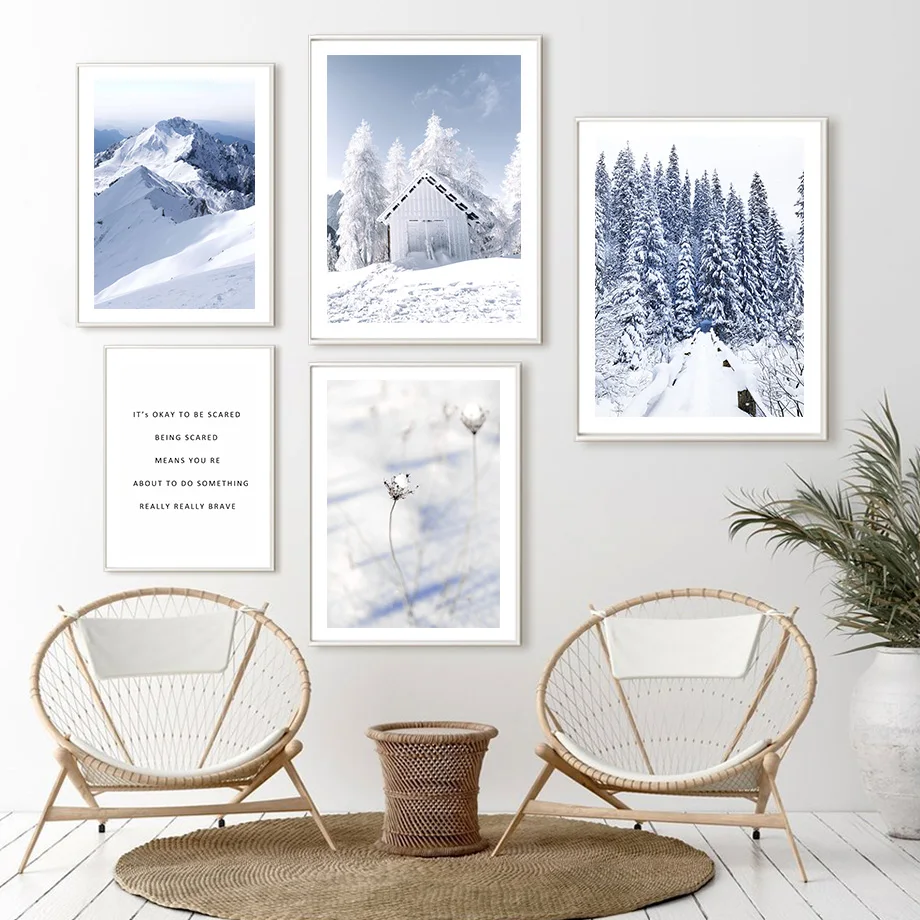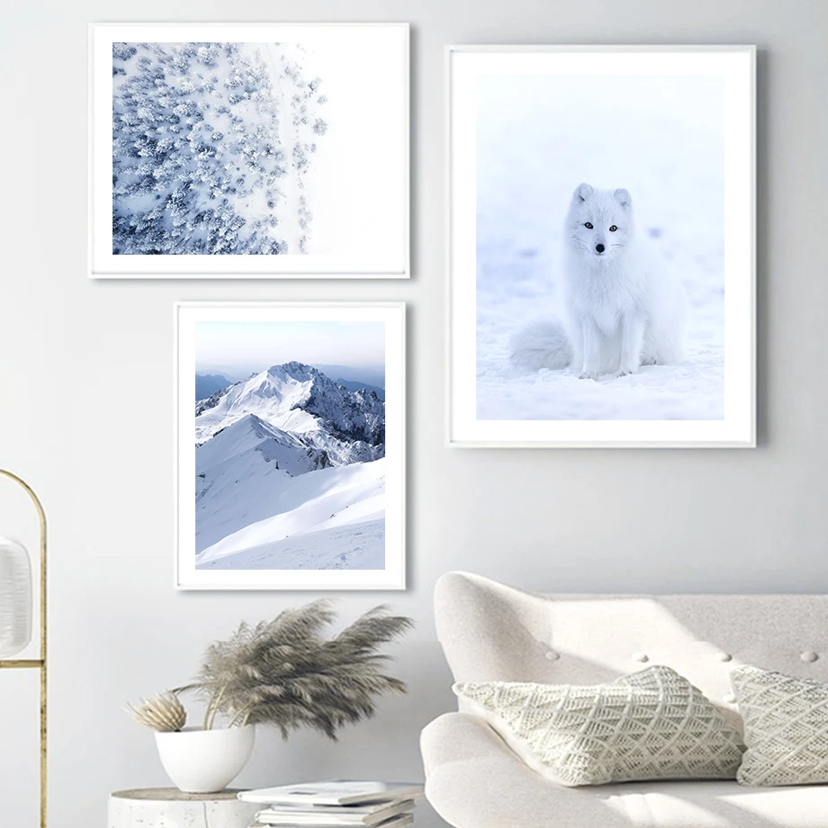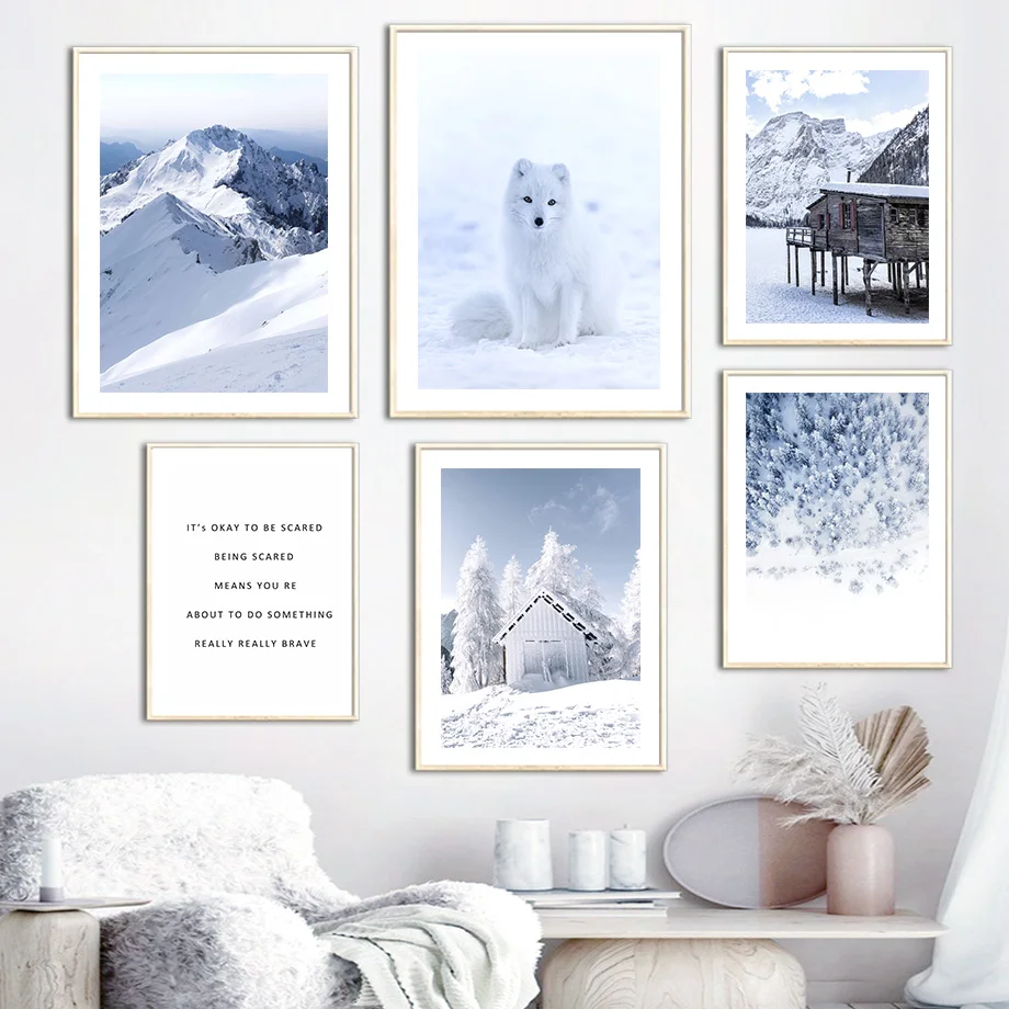 Настенная картина Зимняя Снежная гора, деревянная кабина, лиса, настенная Картина на холсте, скандинавский постер и печать картин для украшения гостиной