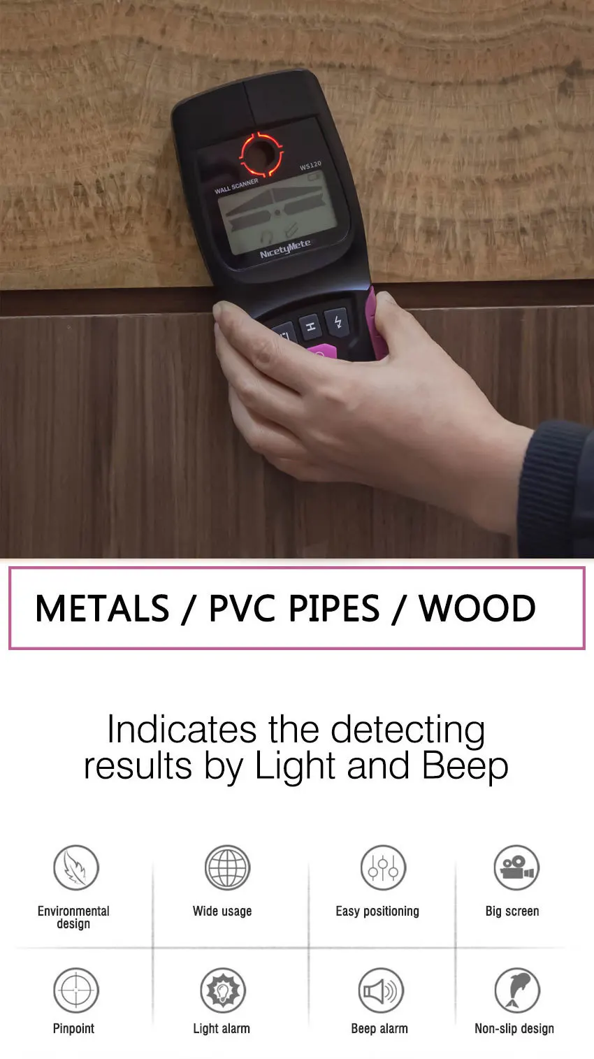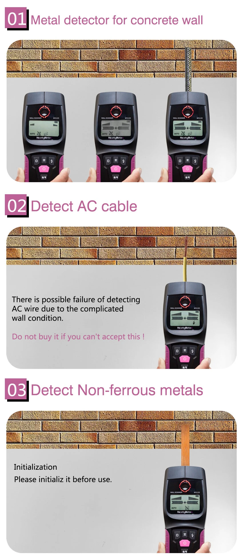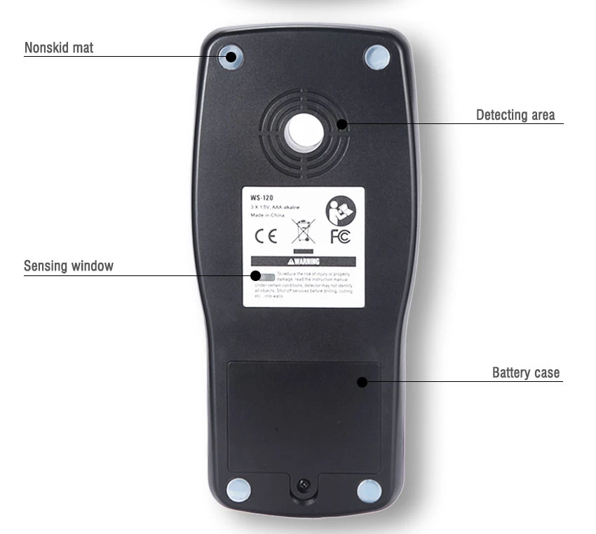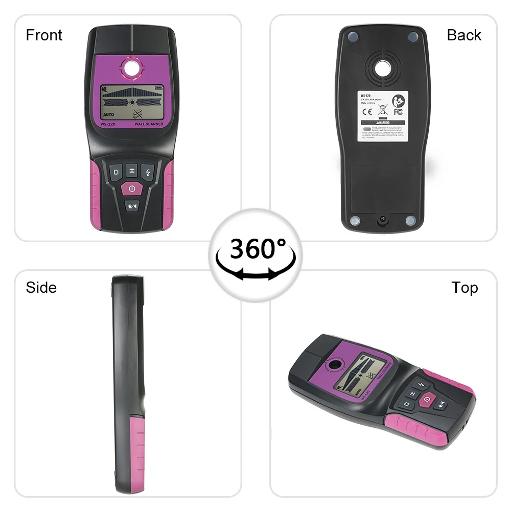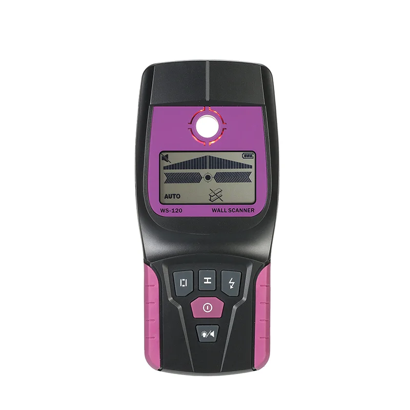 WS-120-это ручной настенный сканер для быстрого обнаружения магнитных металлов в стенах, на крыше и полу, таких как армирующие стали, железные трубы и немагнитные металлы, такие как алюминиевые трубы, медные трубы, И неметаллических материалов, таких как балки, водопроводные трубы из ПВХ, а также электрифицированных объектов, как живые провода.
