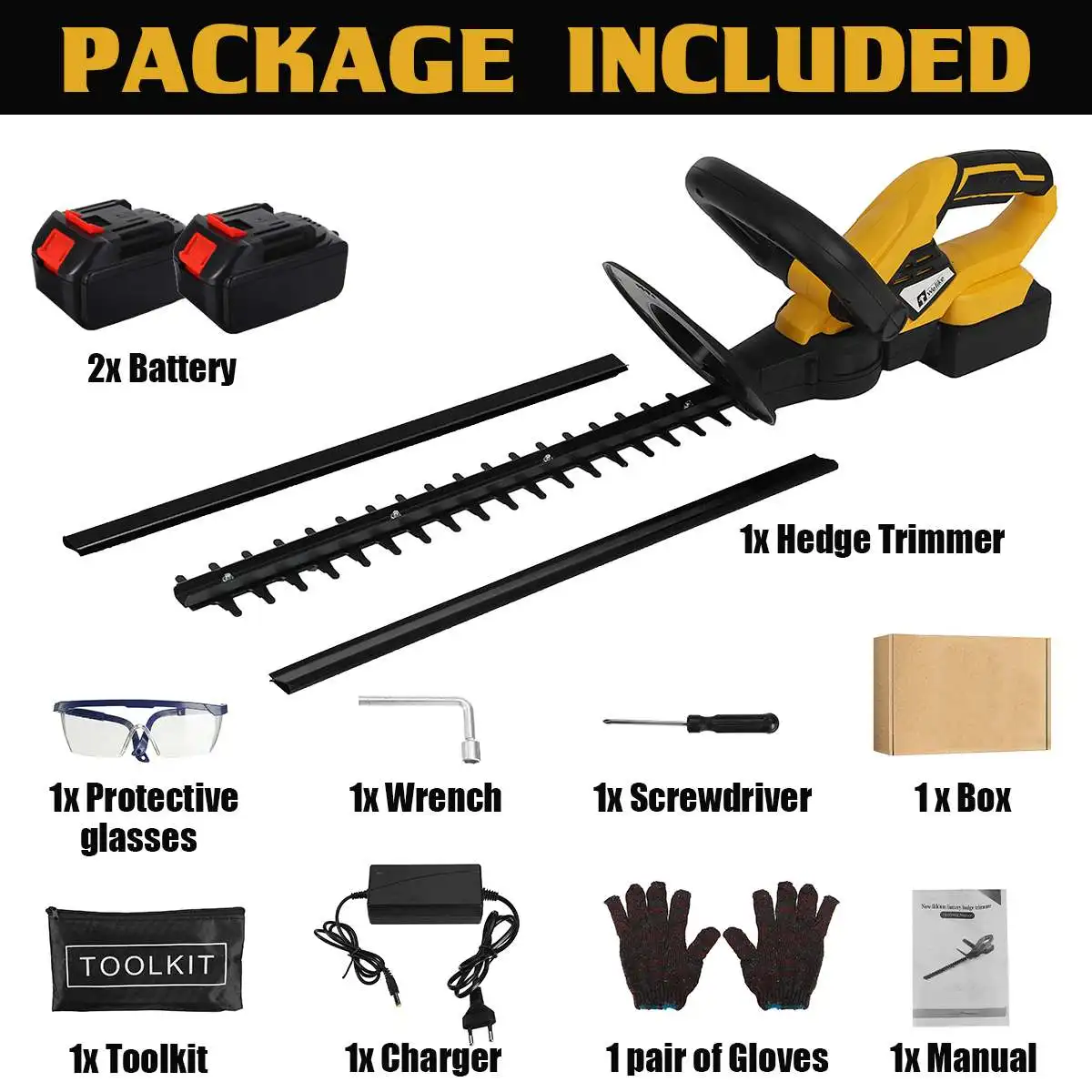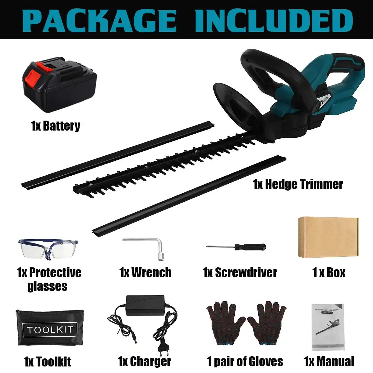 Посылка включает #1:1 x триммер для изгороди1 x крышка лезвия1 х гаечный ключ1 x очки1 х Сумки для хранения1 x Пустая емкость для масла1 пара x GlofАккумулятор-1 шт.Зарядное устройство-1 шт.