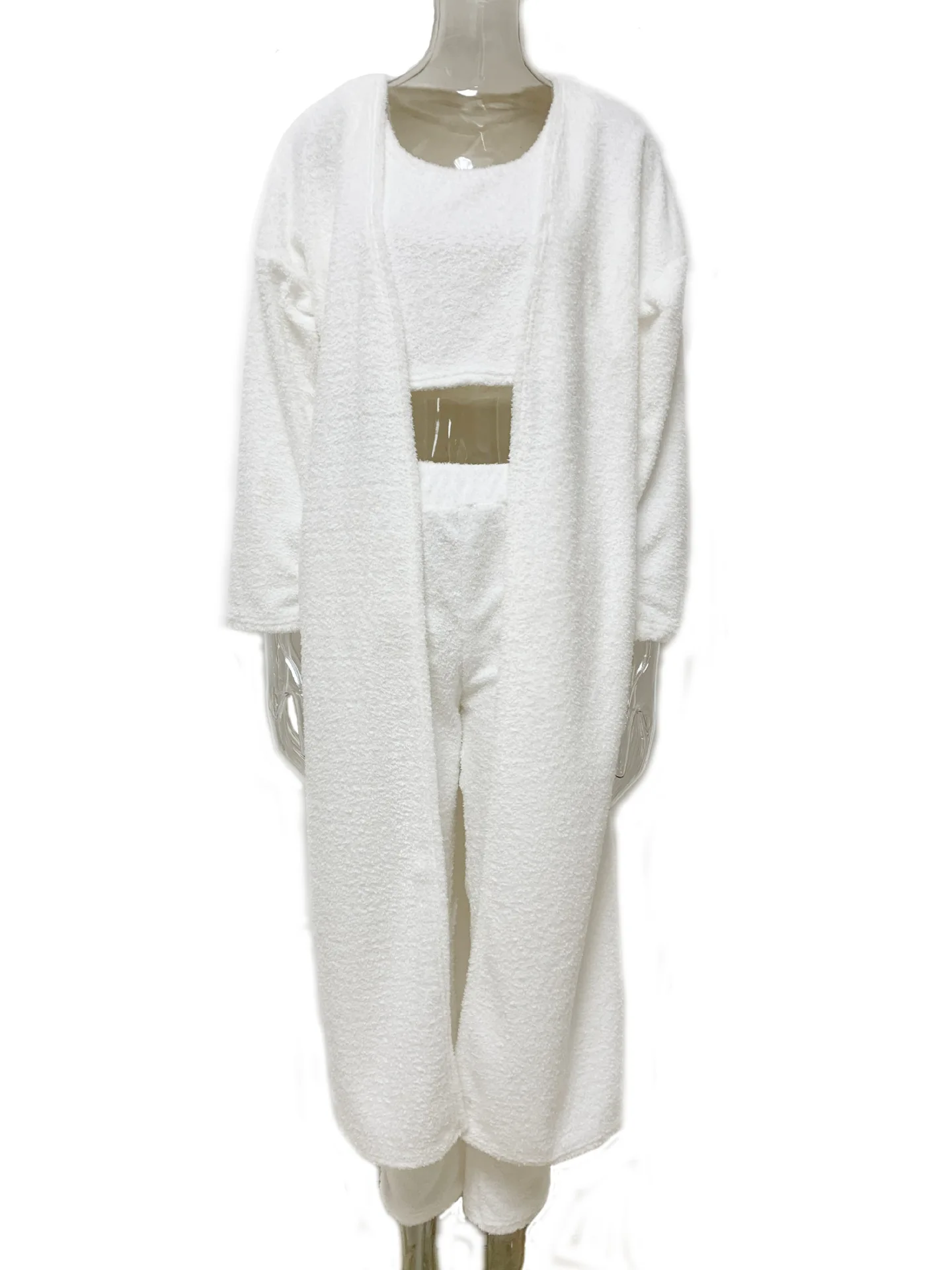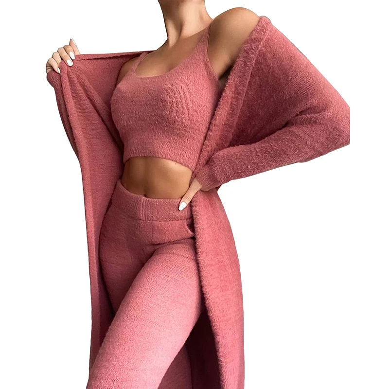 Осенне-зимние мягкие пушистые комплекты из трех предметов, женские пикантные укороченные топы с открытыми плечами и длинные брюки, мужской костюм, повседневный женский костюм из 3 предметов