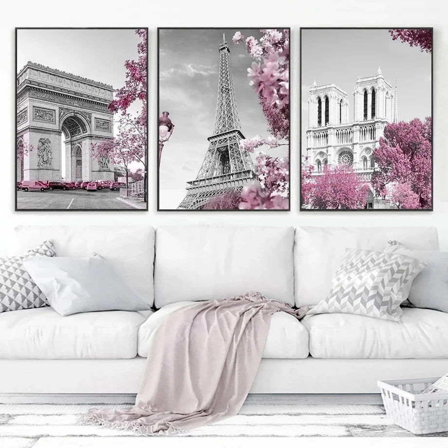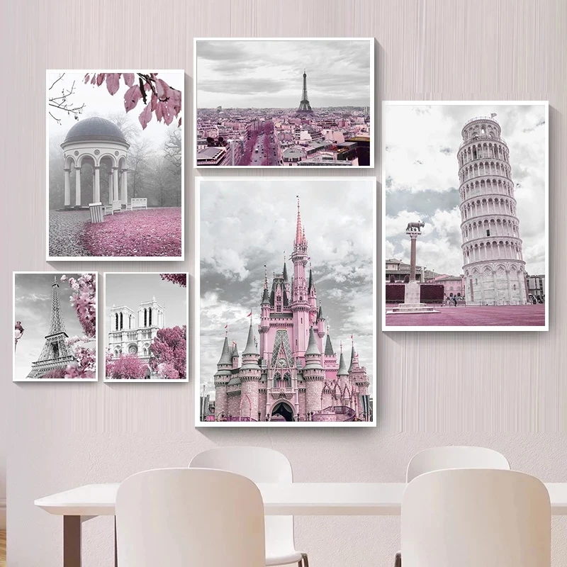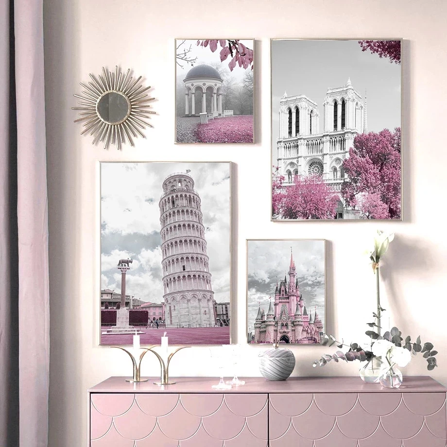 Современный постер в скандинавском стиле, настенное искусство, серый, розовый принт, Европейское здание, архитектура, холст, живопись, домашний декор, декор для гостиной