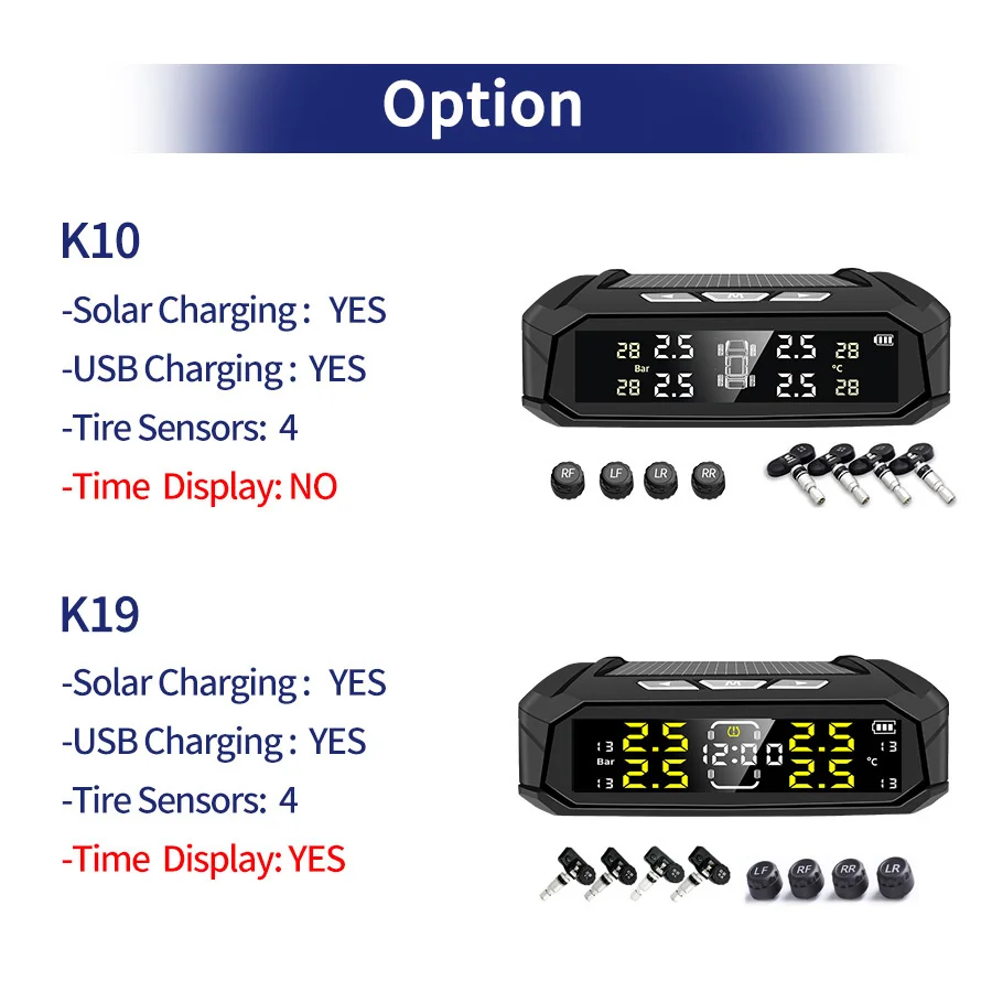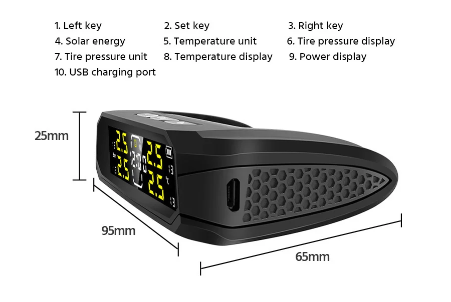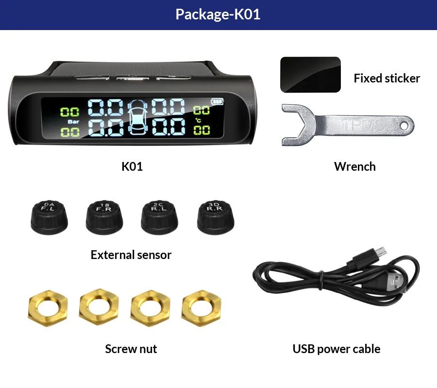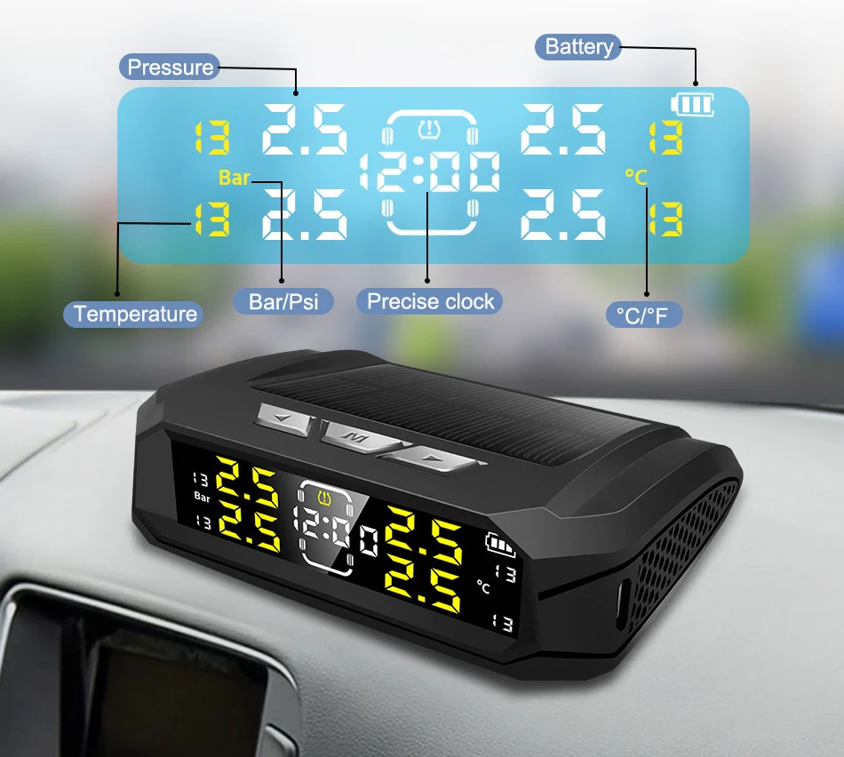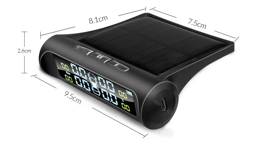 -Солнечная энергия + USB зарядка, не нужно заряжать при подключении автомобильного прикуривателя;-Яркое цифровое ЖК-дисплей, четкое отображение информации о шинах;-Контроль давления и температуры в задней части 4 шин;-Низкое давление воздуха/сигнализация высокой температуры;-Высокая температура/Утечка/Низкий уровень заряда батареи;-Интеллектуальная ударная загрузка при движении автомобиля, не нужно включать/выключать;-Беспроводное подключение с помощью датчиков, простая установка;-Внутренние датчики и внешние датчики отвечают всем вашим потребностям;-Два блока (PSI / Bar) изменяются, вы можете установить тот, который вам нравится.