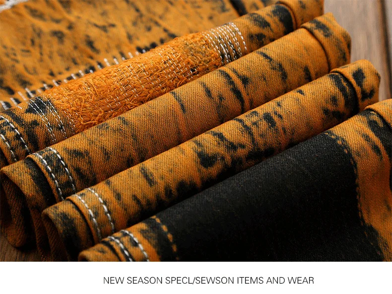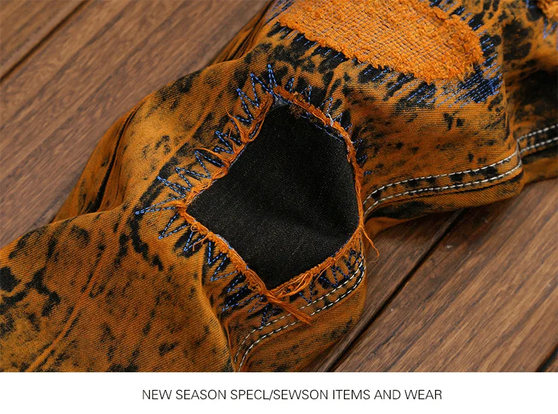 Джинсы мужские рваные в стиле ретро, Модные зауженные прямые джинсы с дырками, с желтым принтом и вышивкой
