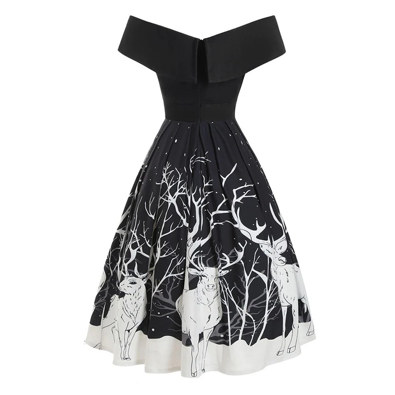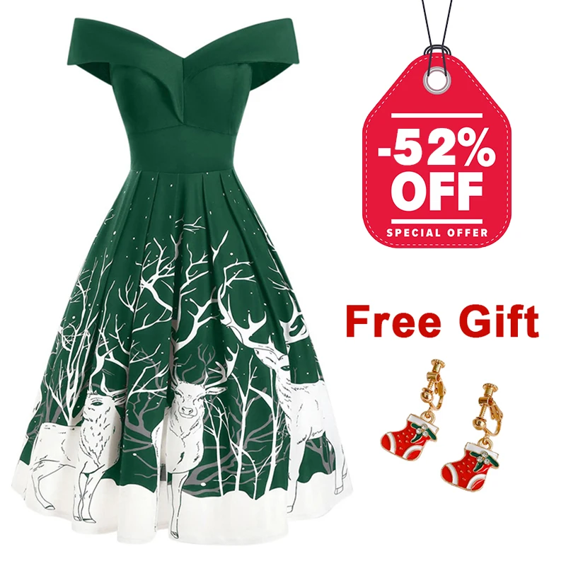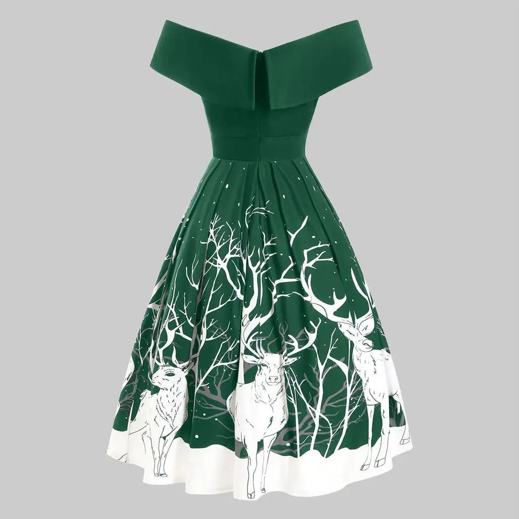 Женское вечернее платье с открытыми плечами, зеленое винтажное платье с V-образным вырезом и принтом на Рождество, 2021