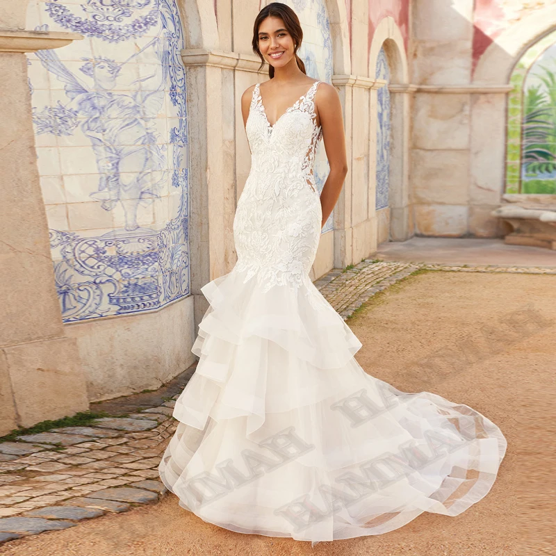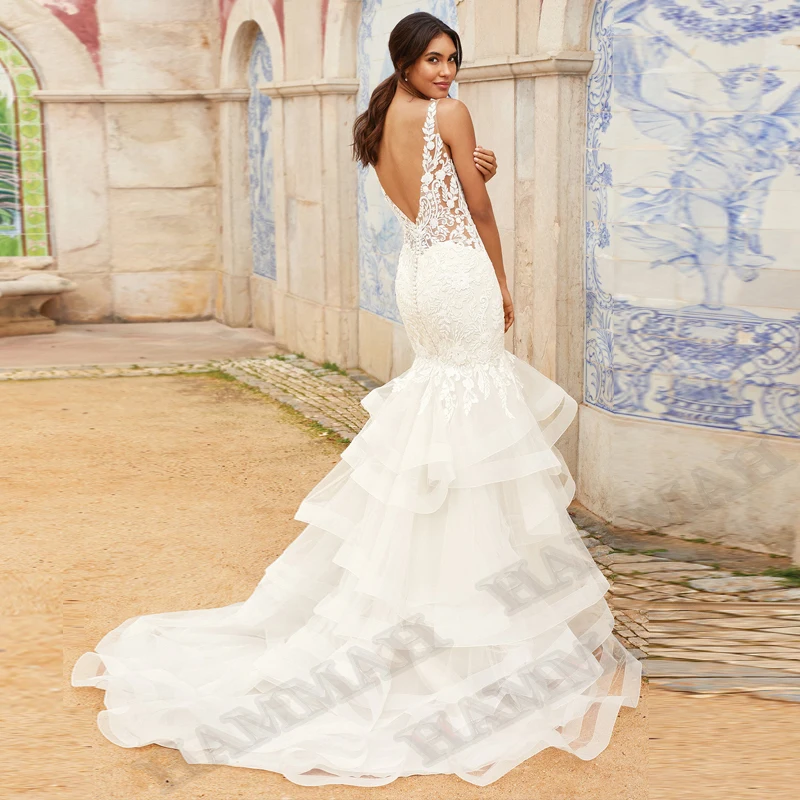 KeywordsFancy Vestidos de Noivas Wedding Dresses Tiered Backless V Neck Engagement Bridal Party Bride Gowns Robe De Mariée Customized