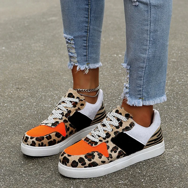 Кеды женские с леопардовым принтом, повседневные холщовые кроссовки на шнуровке, на плоской подошве, Вулканизированная подошва, контрастные цвета