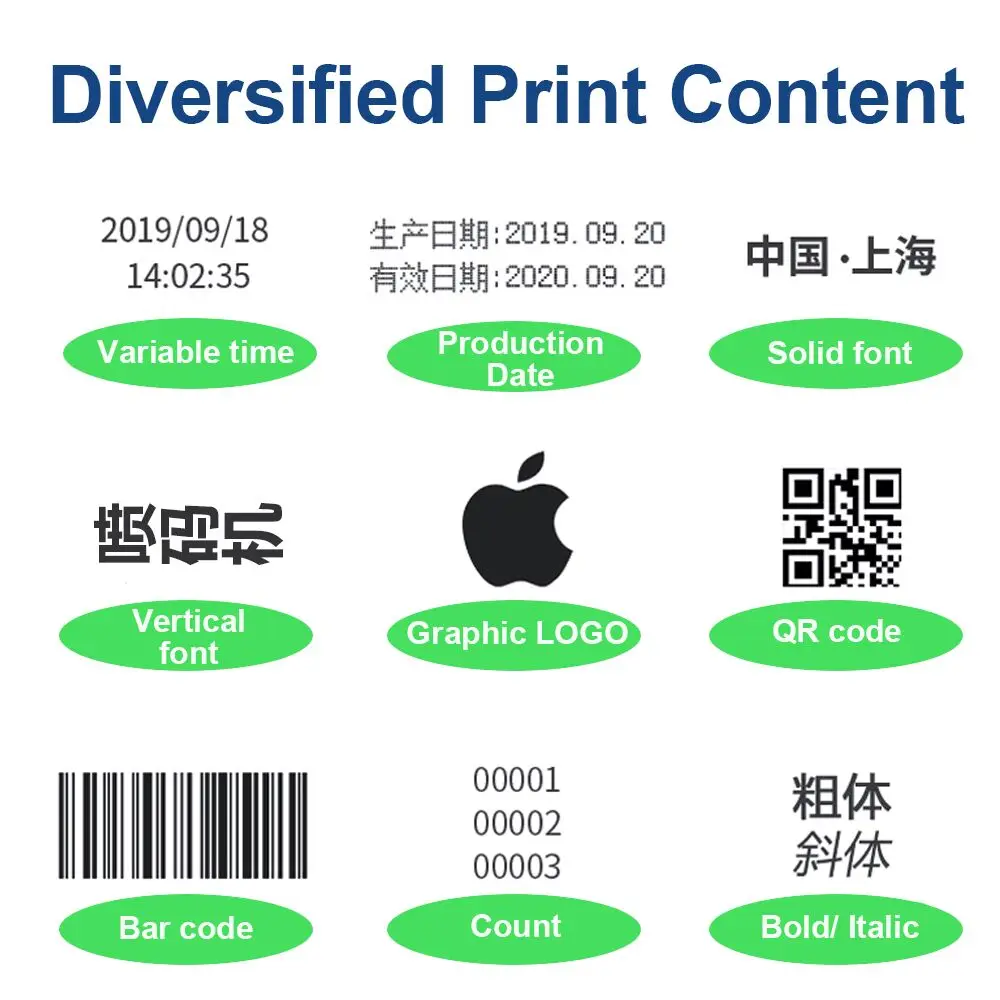 Размер сенсорного экрана:4,3 дюймов Высота печати:2-12,7 мм (регулируется) Язык печати:Английский и китайский Расстояние печати: 2-5 мм Точность печати:600DPI Скорость печати: 70 м/мин Гарантийный срок: 1 год Использование окружающей среды: 0 ~ 40 ℃ Ввод содержимого печати: Машинная запись или импорт u-диска 1 чернильный картридж Количество принтов: около 800, 000 символов Цвет картриджа: по умолчанию черный, пожалуйста, свяжитесь с нами, если вам нужны другие цвета Поддержка формата импорта изображений:BMP Функция хранения содержимого принтера: Поддержка Тонкая настройка содержимого печати: Поддержка Сертификация: CE Содержание печати: qr-код, штрих-код, изображение формата BMP, текст, символ, дата, логотип и т. Д. Применение: картонная коробка, полиэтиленовый пакет, этикеточная карта, IC / IP карта, керамика, стеклянная бутылка, проволока, металлическая крышка и т. Д.